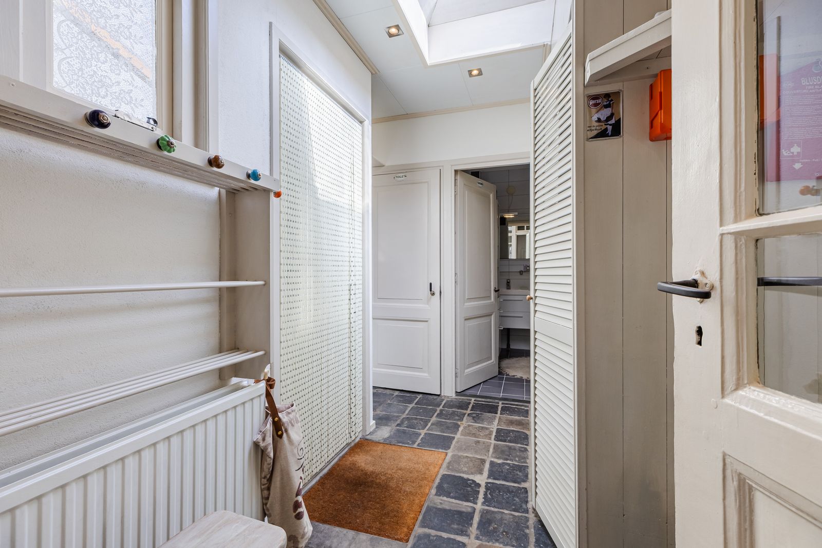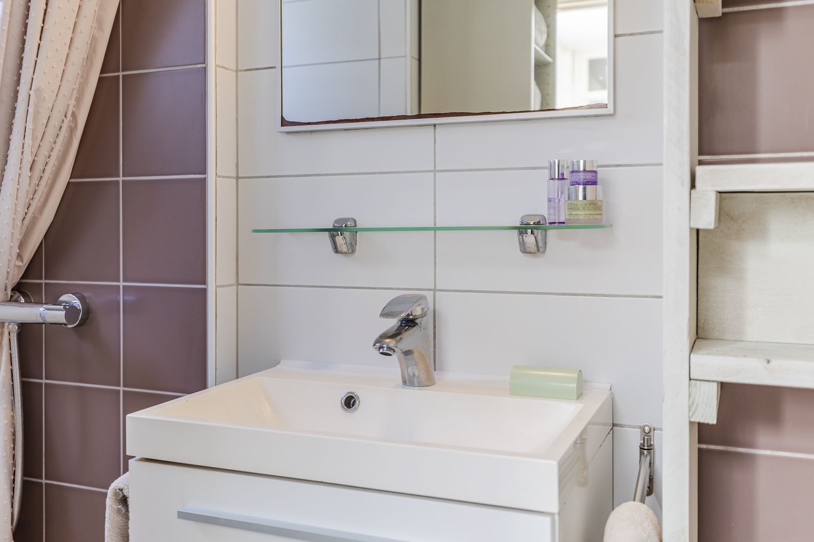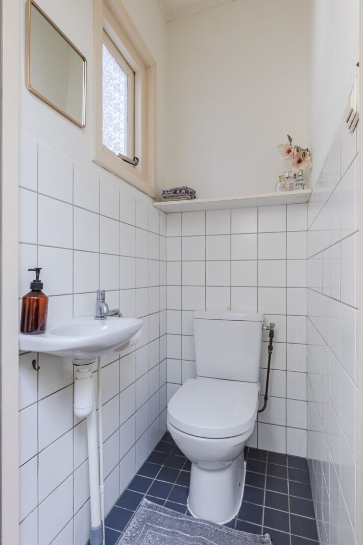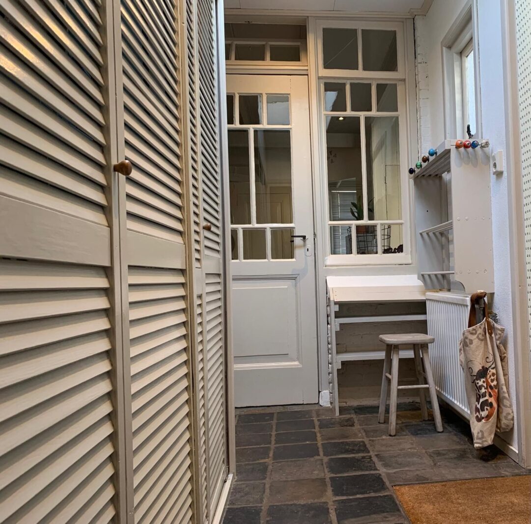 In de praktische bijkeuken met antieke vloertegels en lichtkoepel bevinden zich de koelkast, wasmachine, droger en de cv-opstelling. Tevens vind je hier het toilet en de betegelde badkamer met douche, wastafelmeubel en een raam voor natuurlijke ventilatie. Vanuit de bijkeuken heb je direct toegang tot de tuin.