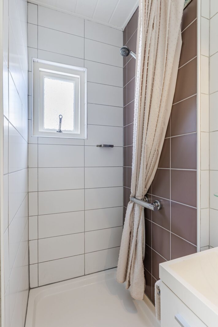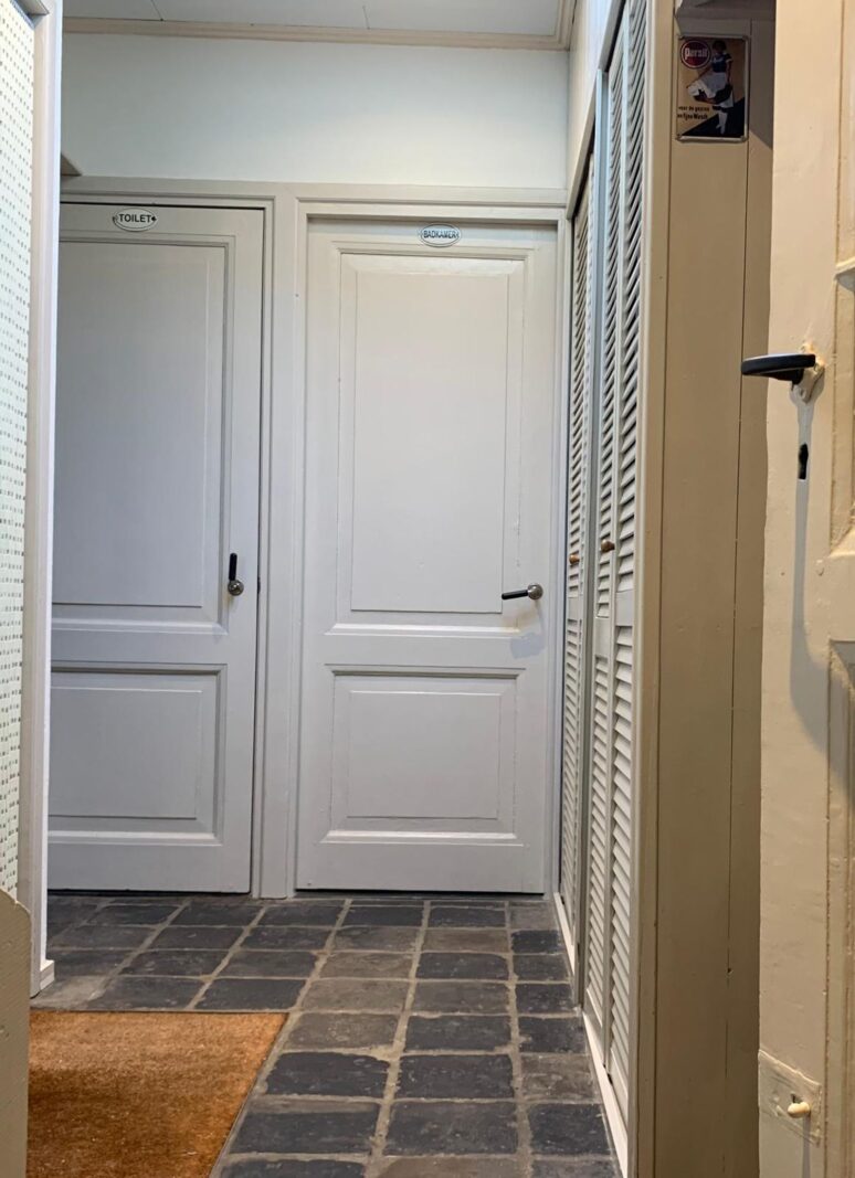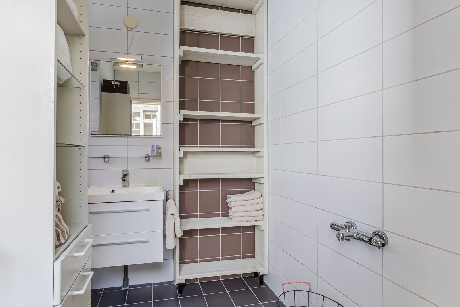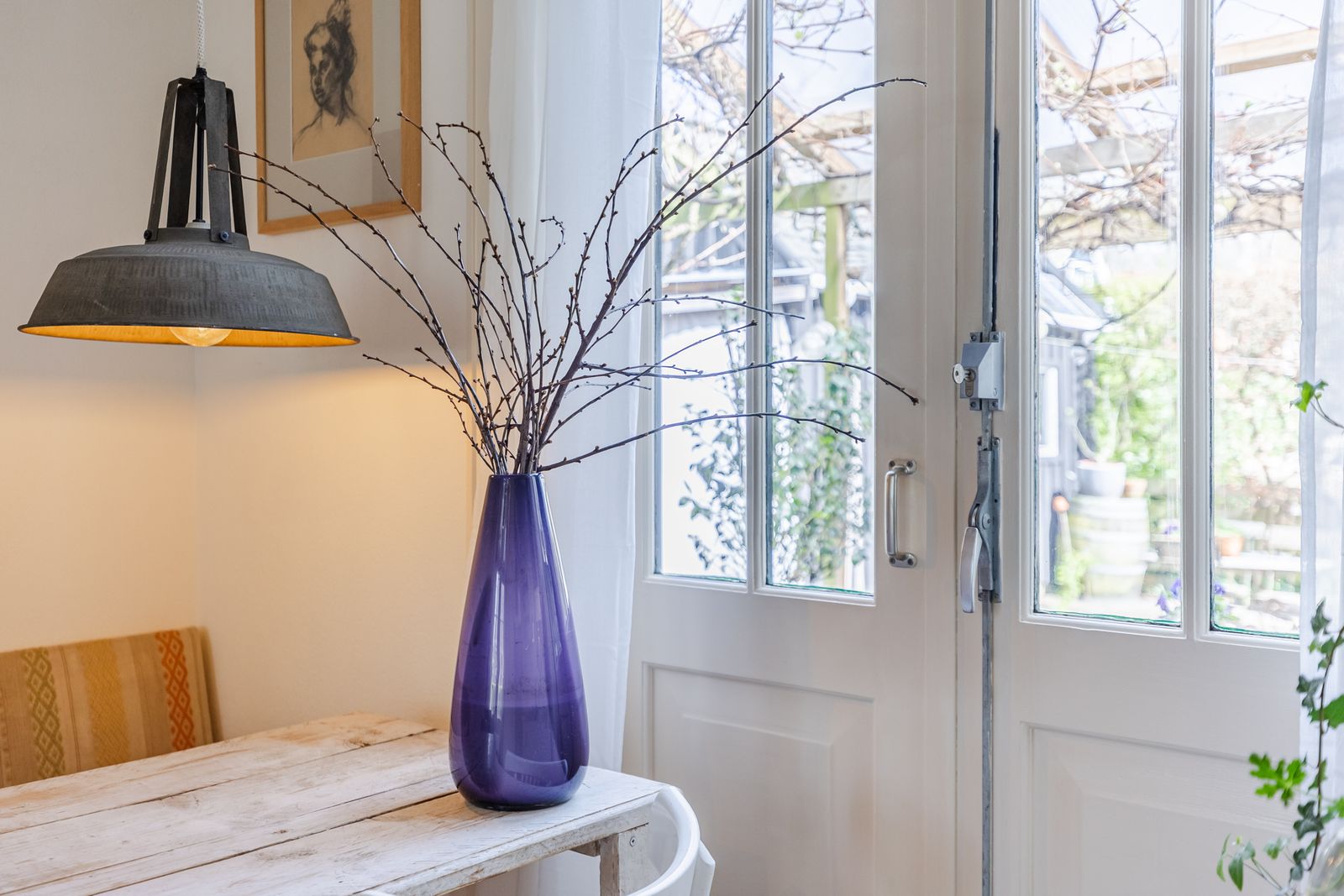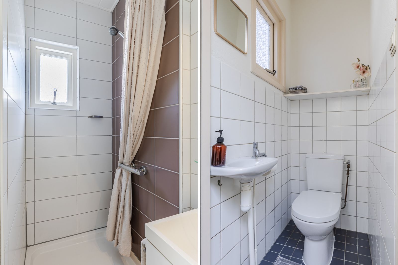 In de praktische bijkeuken met antieke vloertegels en lichtkoepel bevinden zich de koelkast, wasmachine, droger en de cv-opstelling. Tevens vind je hier het toilet en de betegelde badkamer met douche, wastafelmeubel en een raam voor natuurlijke ventilatie. Vanuit de bijkeuken heb je direct toegang tot de tuin.