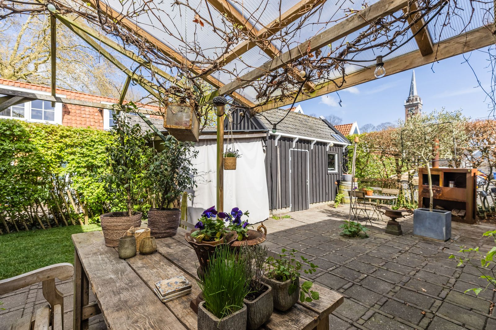 De verzorgde achtertuin, gelegen op het zuidoosten, is een heerlijke plek om te ontspannen en van de zon te genieten. De tuin is fraai aangelegd met bestrating, gras en fruitbomen. Door de mooie hagen om de tuin is er veel privacy. De overkapping maakt het geheel compleet, perfect voor lange avonden buiten. Achterin bevindt zich een ruime, houten schuur voor fietsen, hobby en opslag.