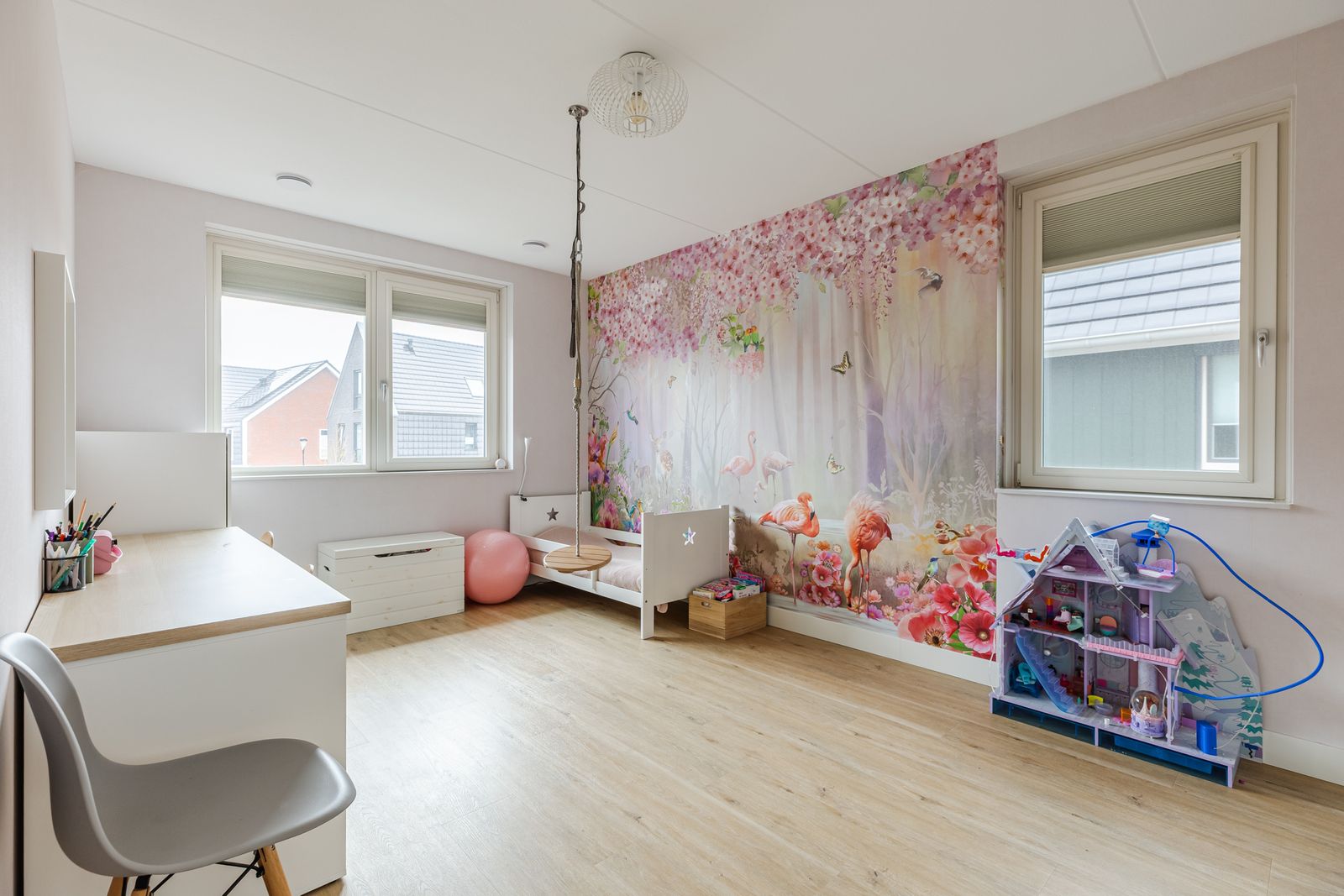 De garage met eigen pantry en een dubbele oprit maken het parkeren en leven praktisch en makkelijk. Ook aan de kinderen is gedacht, zij kunnen zich uitleven op de trampoline in de voortuin.