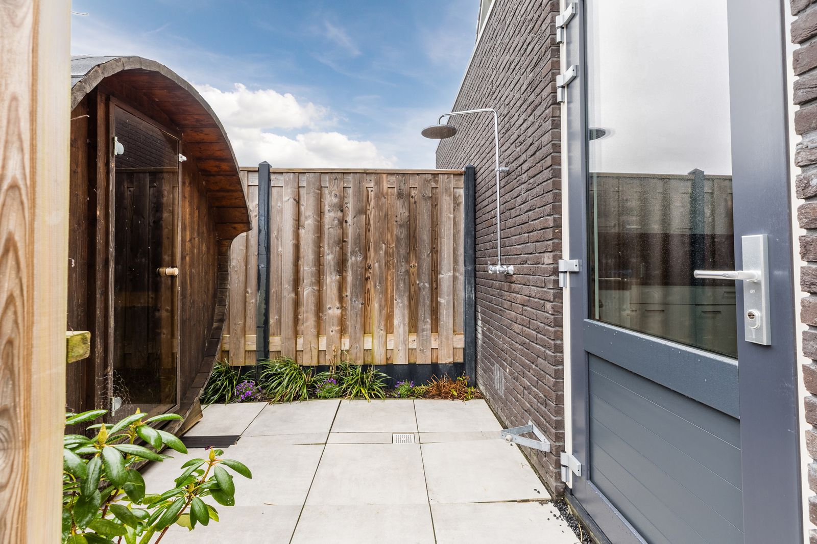 Privé-wellness: Sauna (ter overname) en buitendouche in de zonnige achtertuin en royaal ligbad op eerste verdieping