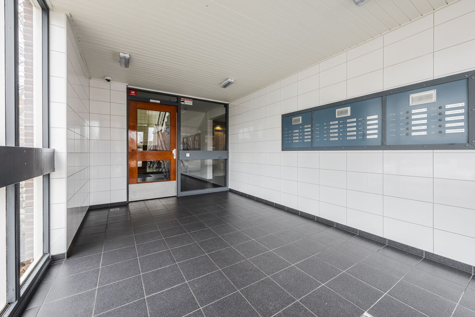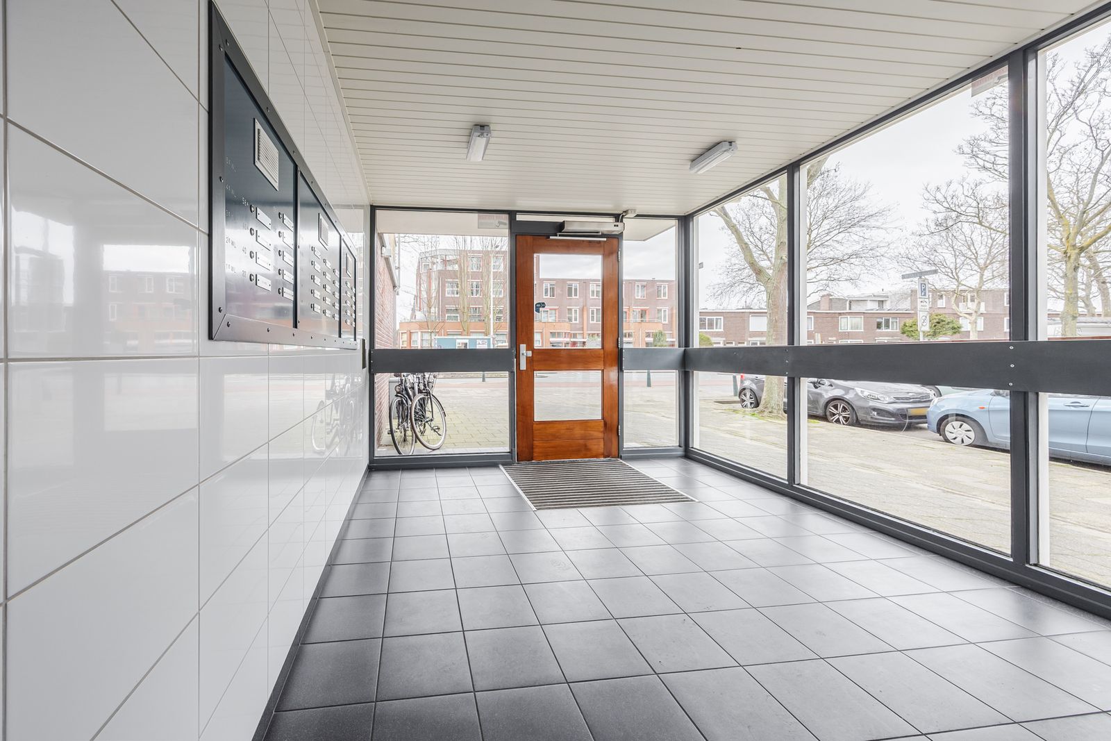 Gesloten portiek met bellentableau en intercom.