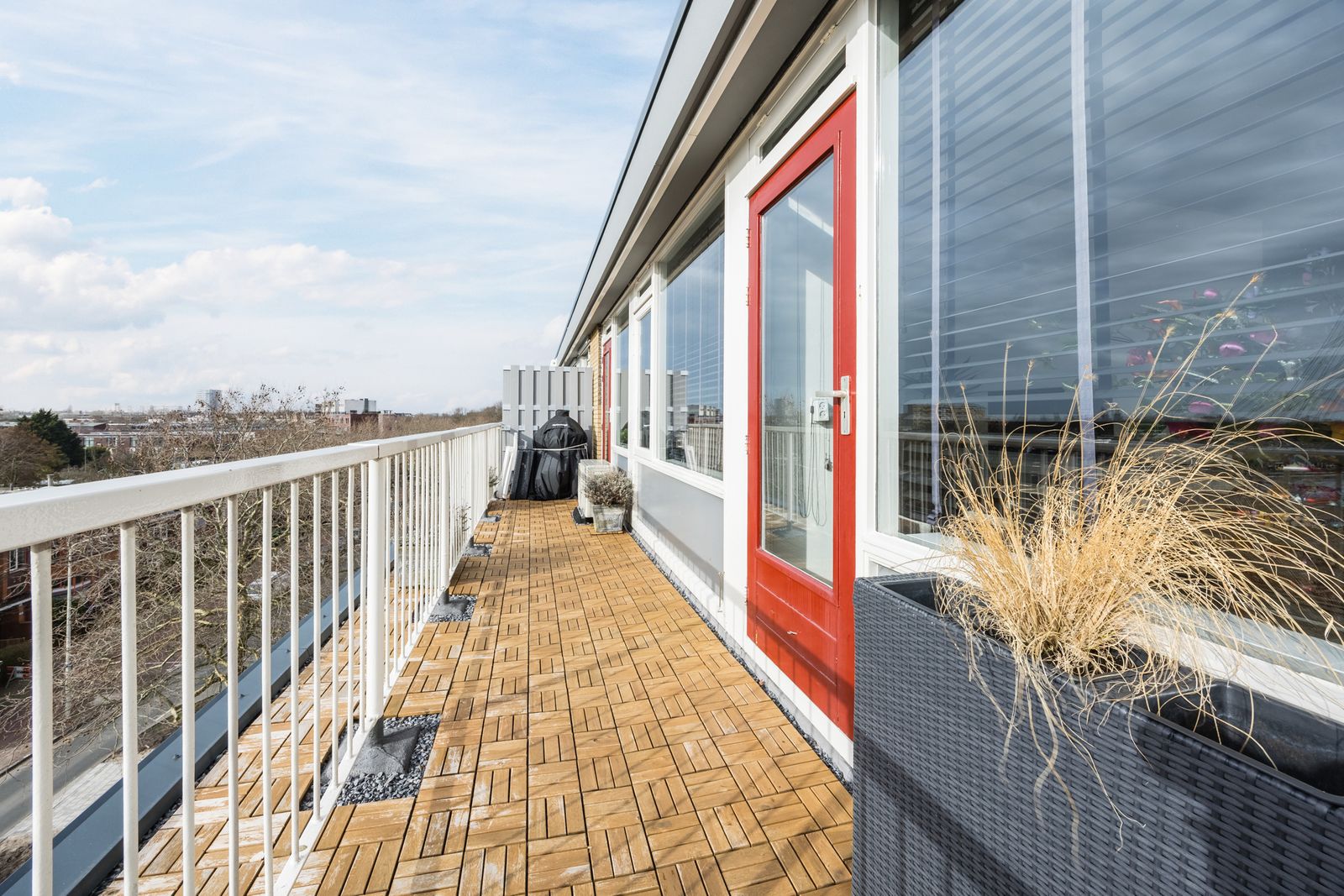 Over de volledige breedte (ca. 9.41 x 1.30 m), gunstig gelegen op ochtend-, middag- én avondzon.