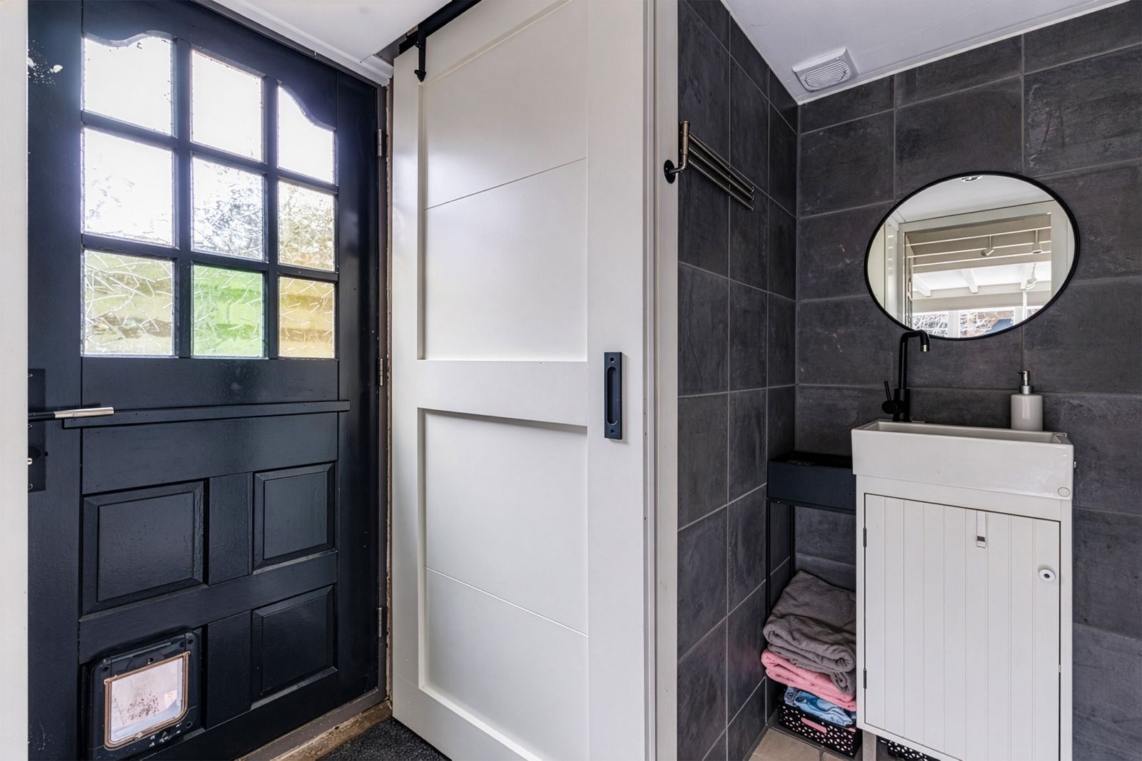 Entree met meterkast, bergruimte met opstelplaats voor wasmachine/droger en de CV-opstelling, toiletruimte en toegang tot de badkamer die voorzien is van een inloopdouche en wastafel. Vanuit de entree is ook de tuingerichte woonkamer bereikbaar met grote raampartijen aan de tuinzijde. De praktische hoekkeuken is aan de voorzijde van de woning.
