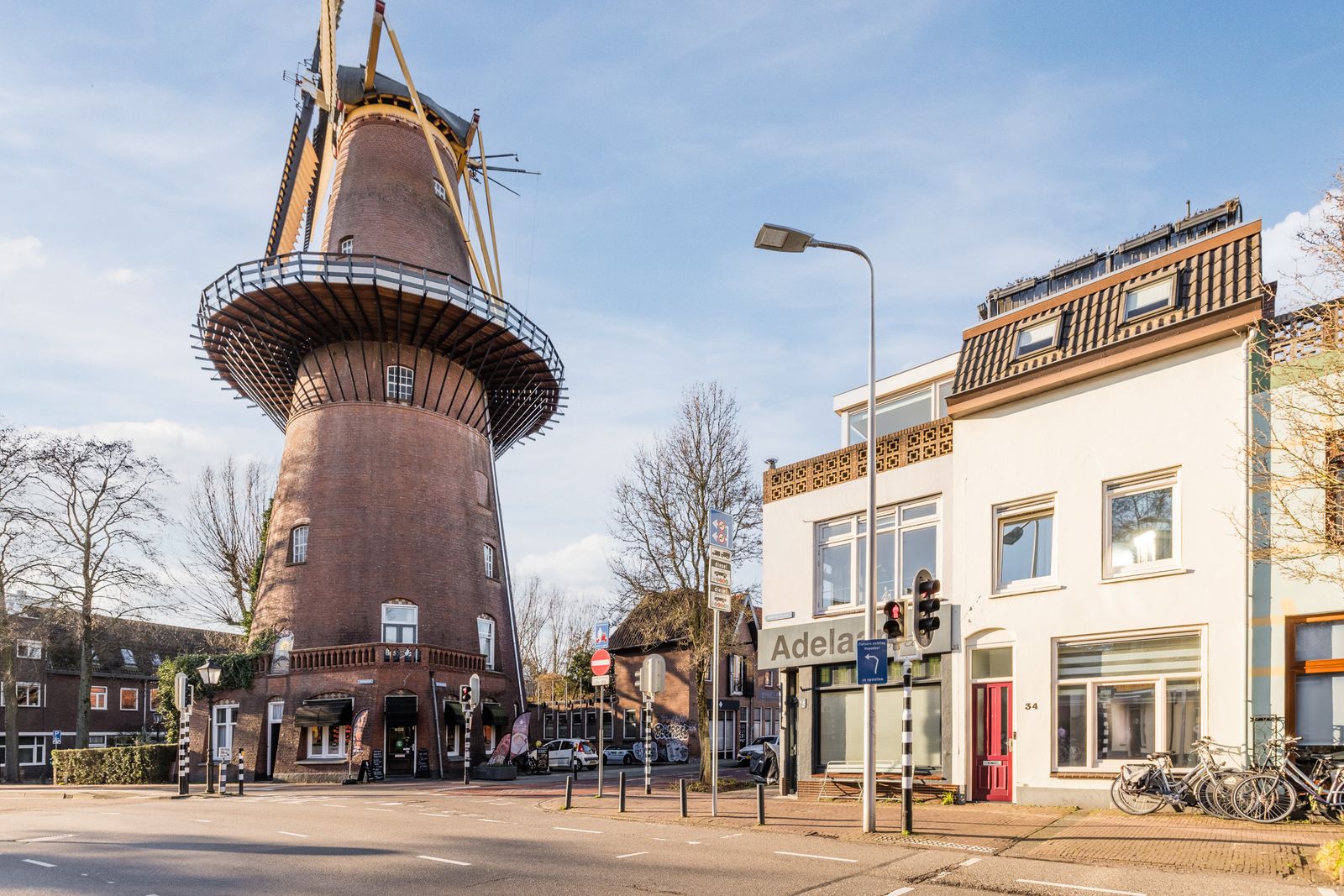 Fraai uitzicht op de Adelaarstraat en de molen