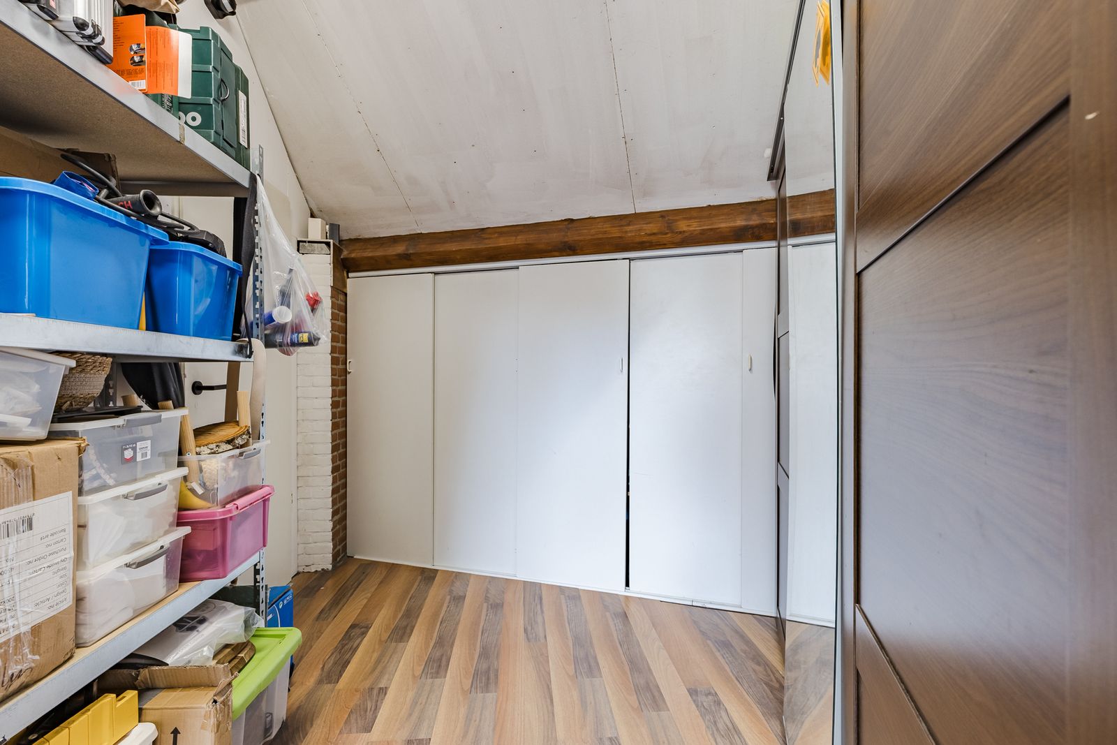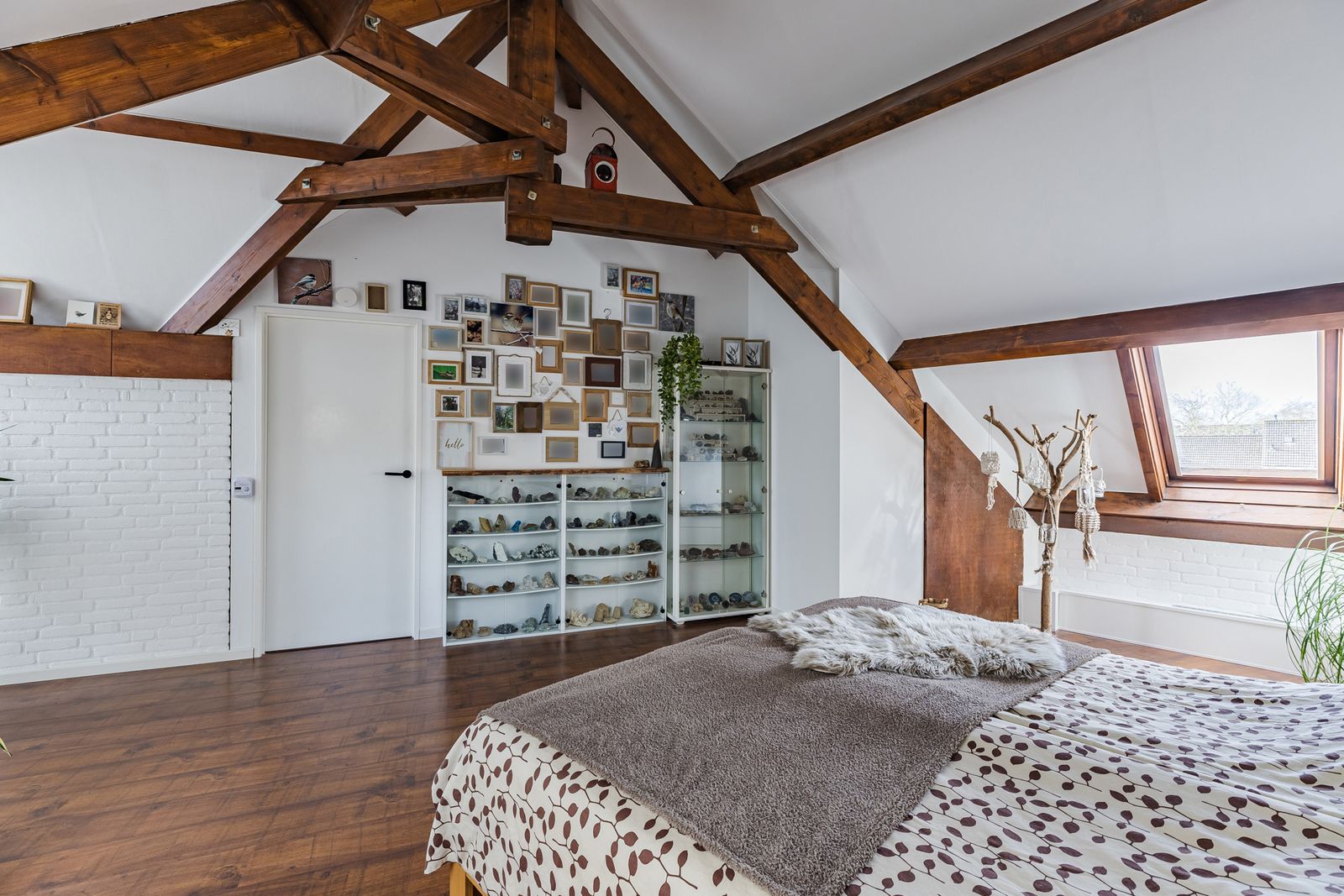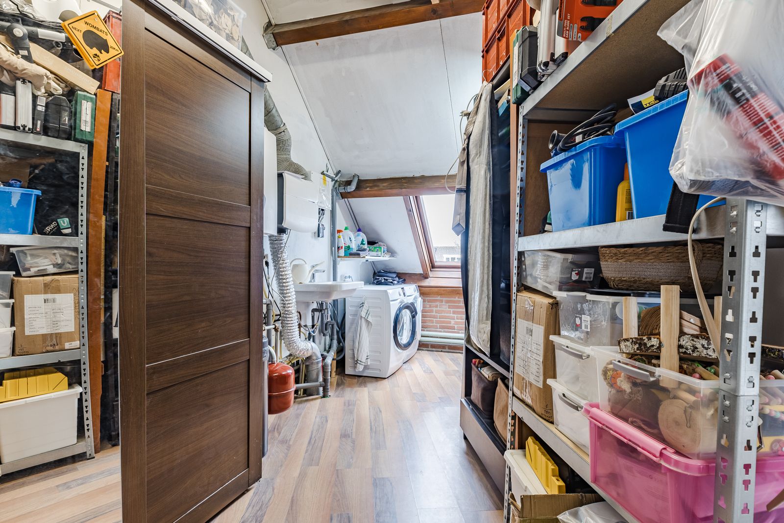 Prachtige zolder verdieping! De zolder is zeer groot en voor vele doeleinden te gebruiken. Nu is deze in tweeën gesplitst: een sfeervolle slaapkamer en een ruimte die wordt gebruikt als inpandige berging met veel kastruimte en tevens staan hier de wasmachine, droger en de HR-combiketel opgesteld.