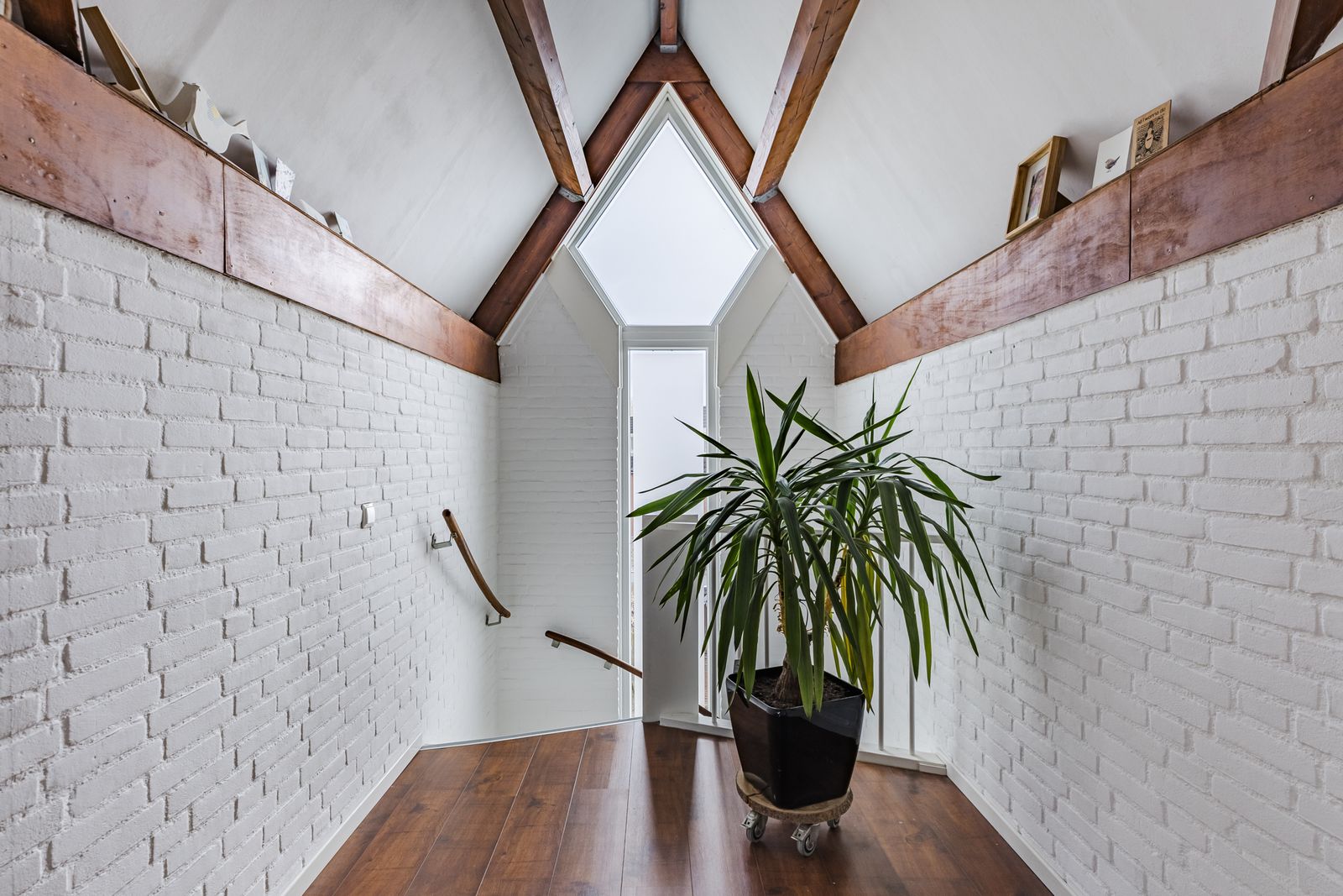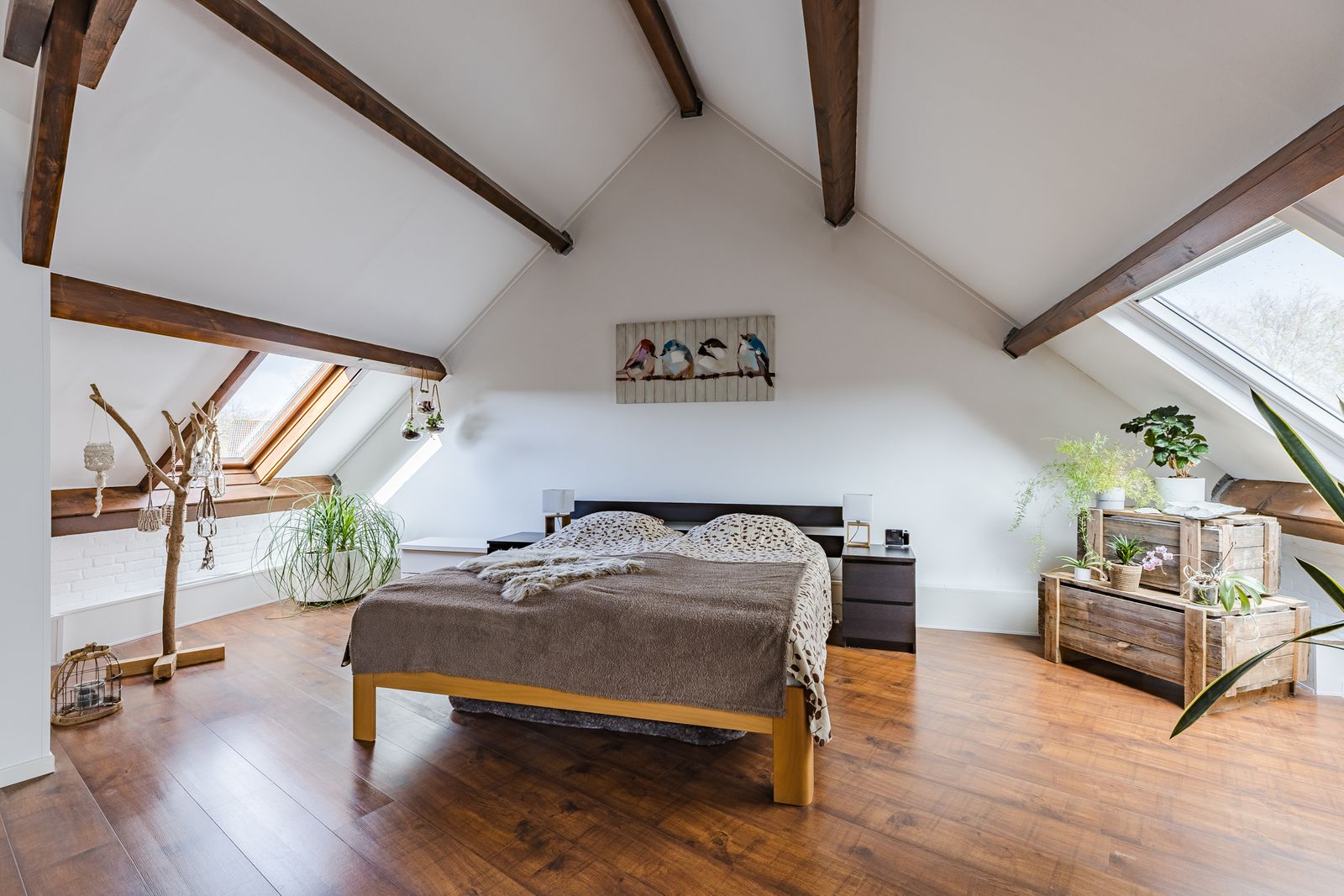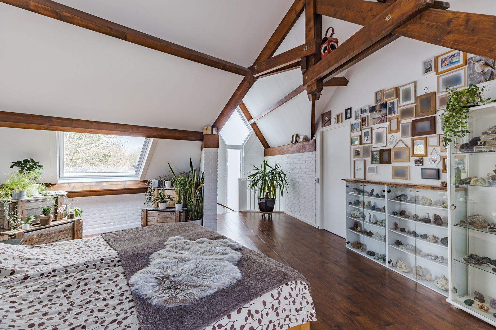 Prachtige zolder verdieping! De zolder is zeer groot en voor vele doeleinden te gebruiken. Nu is deze in tweeën gesplitst: een sfeervolle slaapkamer en een ruimte die wordt gebruikt als inpandige berging met veel kastruimte en tevens staan hier de wasmachine, droger en de HR-combiketel opgesteld.