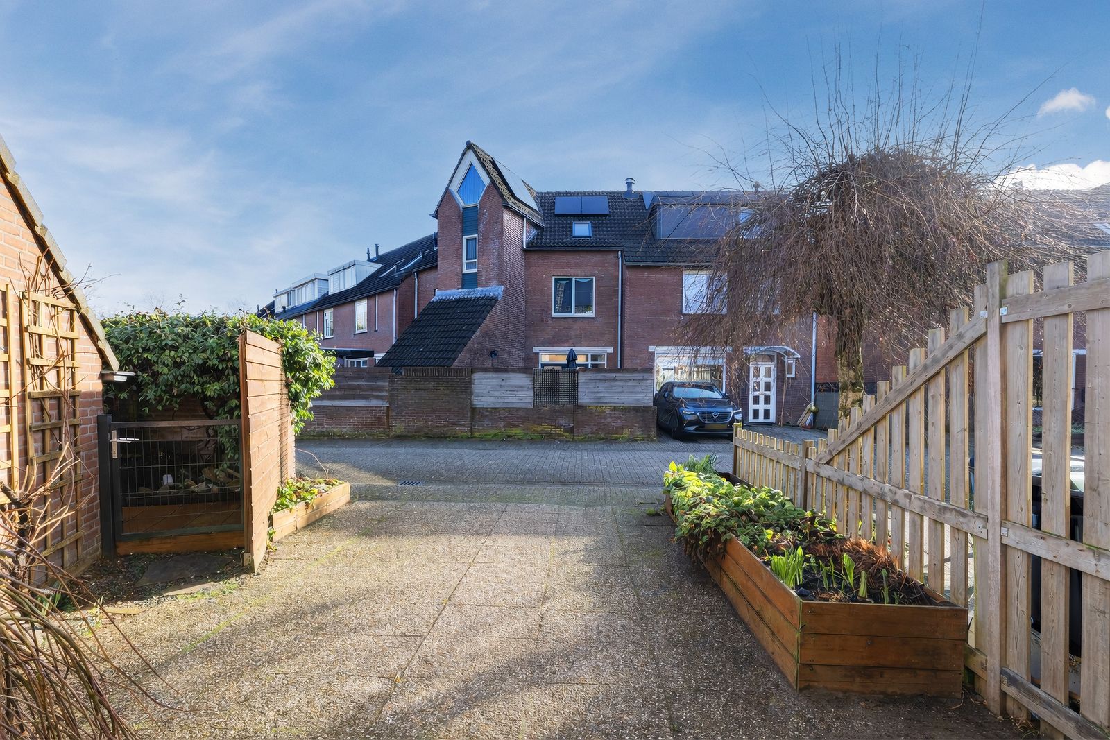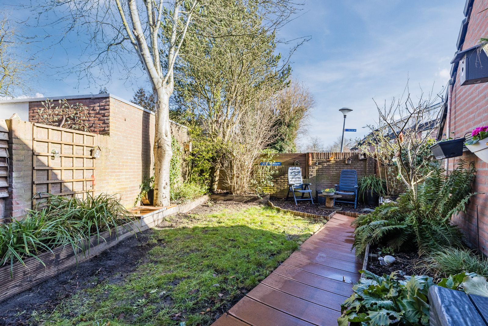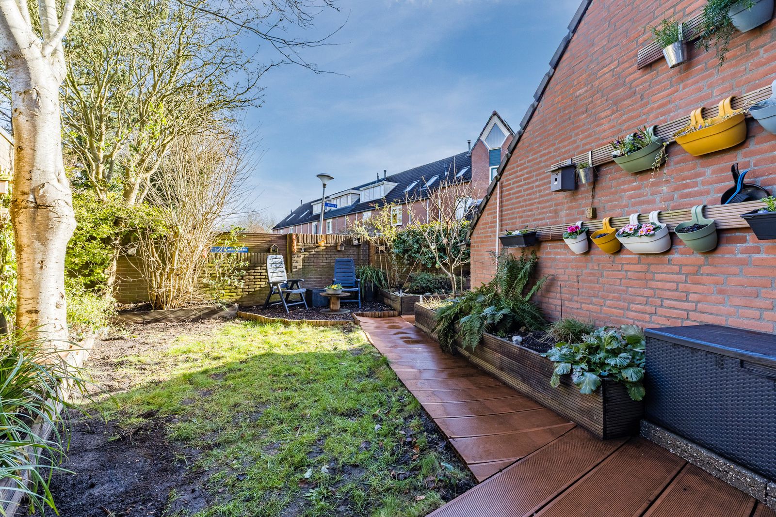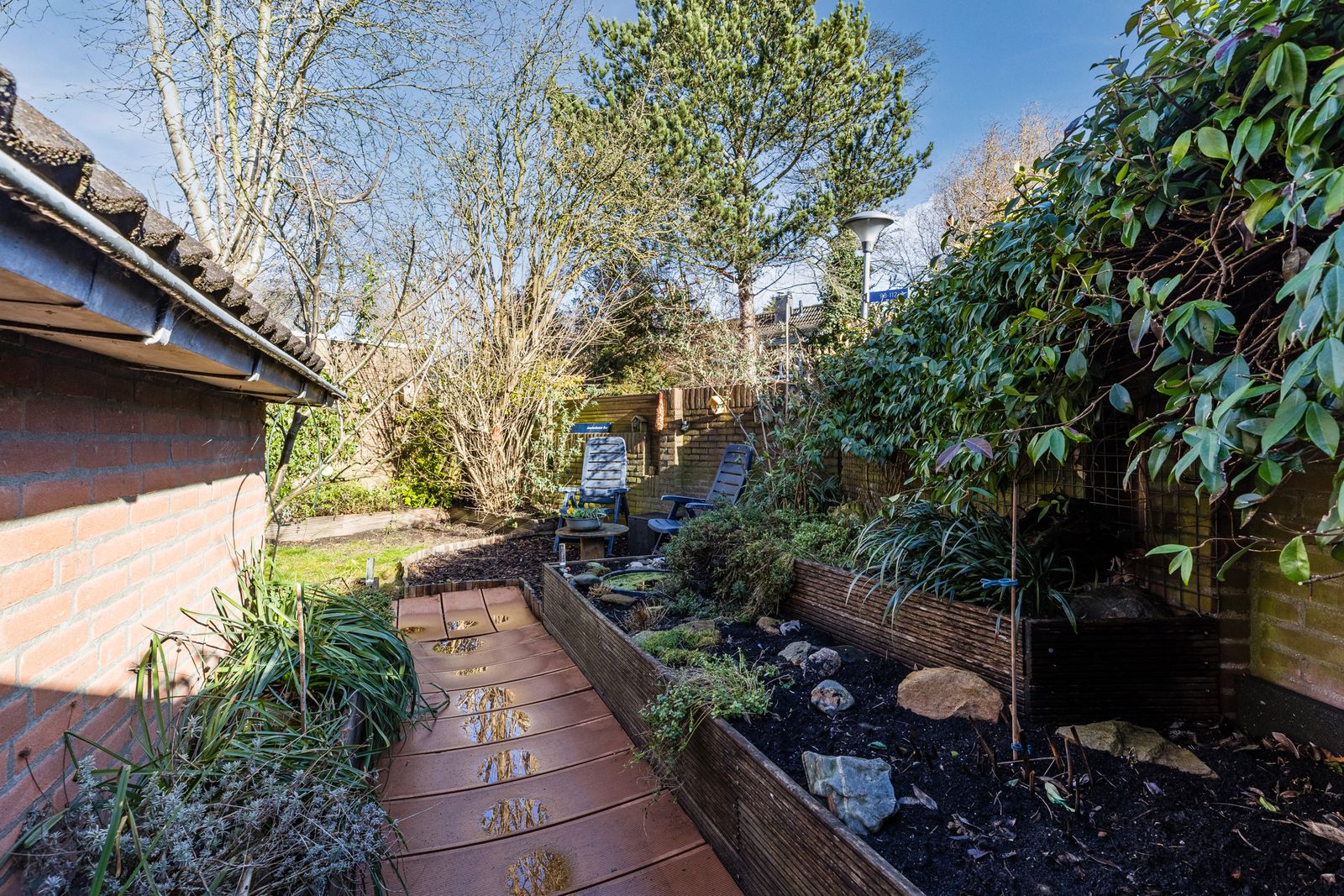 Aan de voorzijde een groene, beschutte tuin met volledige privacy. Voor de avondzon kunt u terecht in de achtertuin (patio), die een doorgang heeft naar het achtergelegen hofje. Omdat alle achtertuinen van de omringende huizen op het hofje uitkomen is dit ideaal voor kinderen. Aan de voorzijde is een ruime oprit voor parkeren op eigen terrein en een aangebouwde berging.