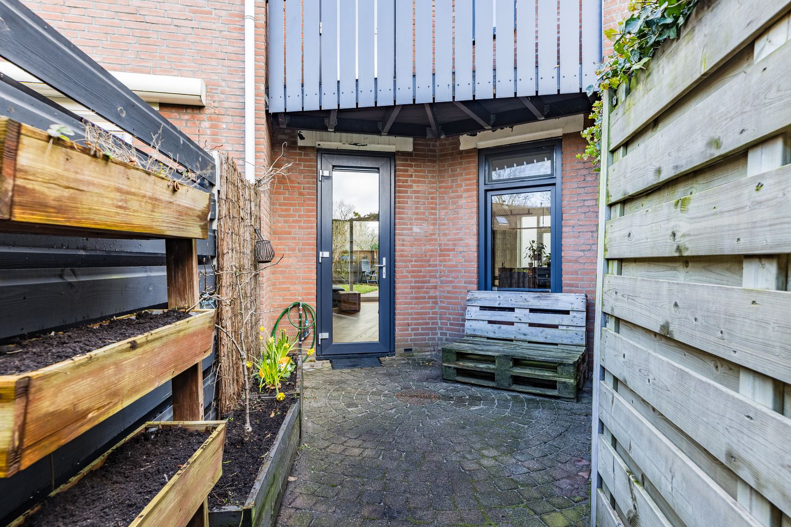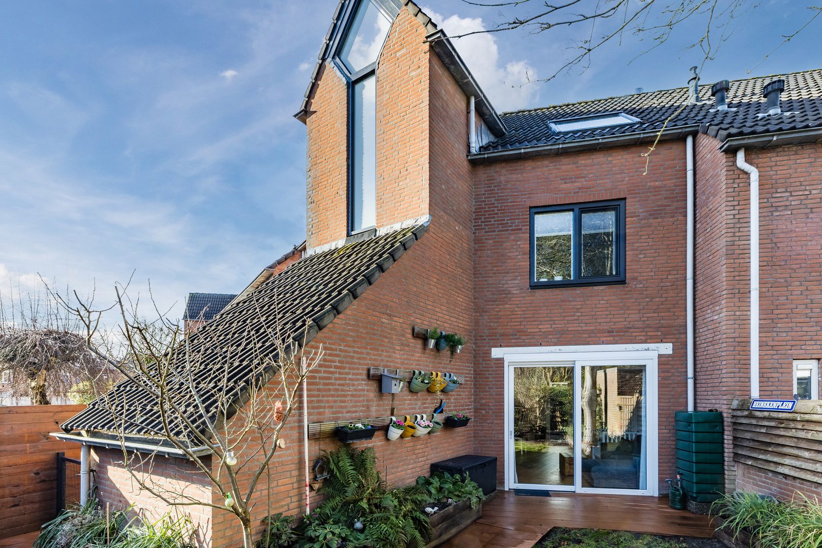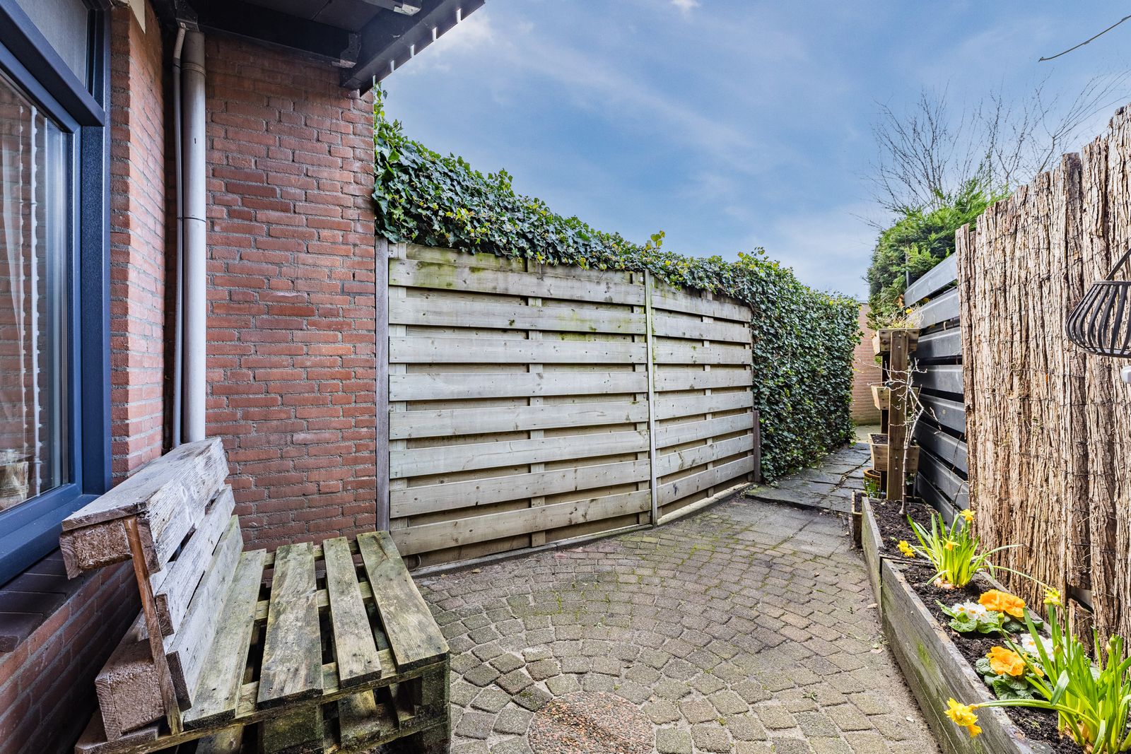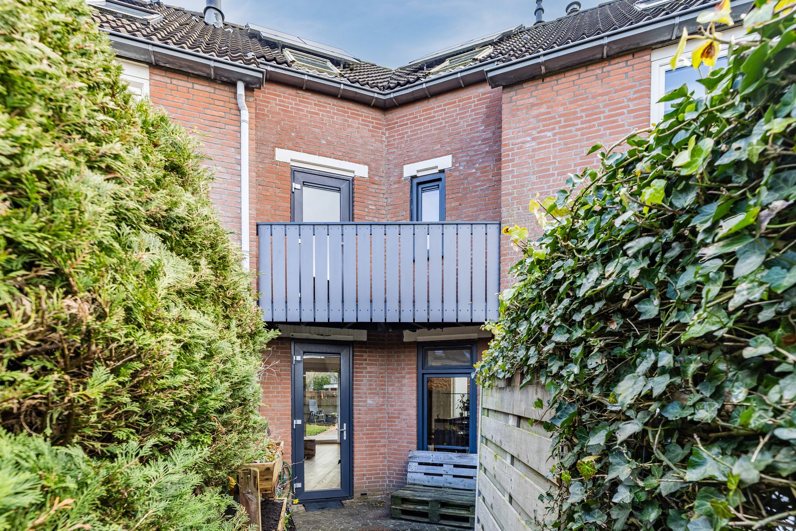 Aan de voorzijde een groene, beschutte tuin met volledige privacy. Voor de avondzon kunt u terecht in de achtertuin (patio), die een doorgang heeft naar het achtergelegen hofje. Omdat alle achtertuinen van de omringende huizen op het hofje uitkomen is dit ideaal voor kinderen. Aan de voorzijde is een ruime oprit voor parkeren op eigen terrein en een aangebouwde berging.
