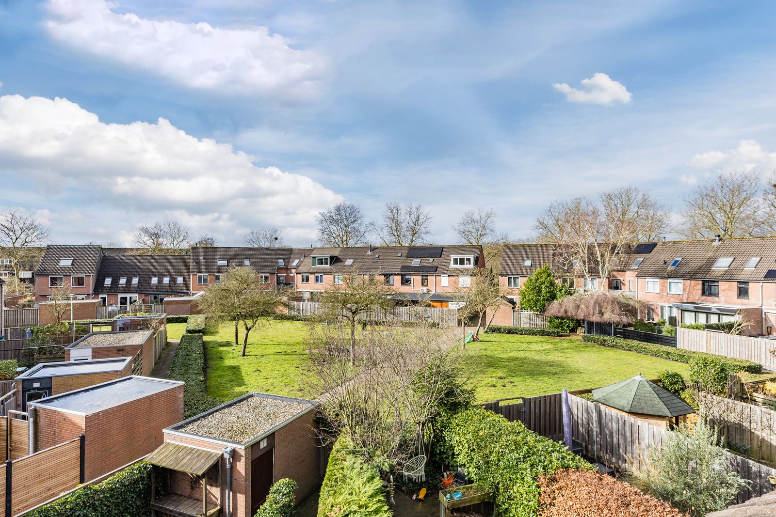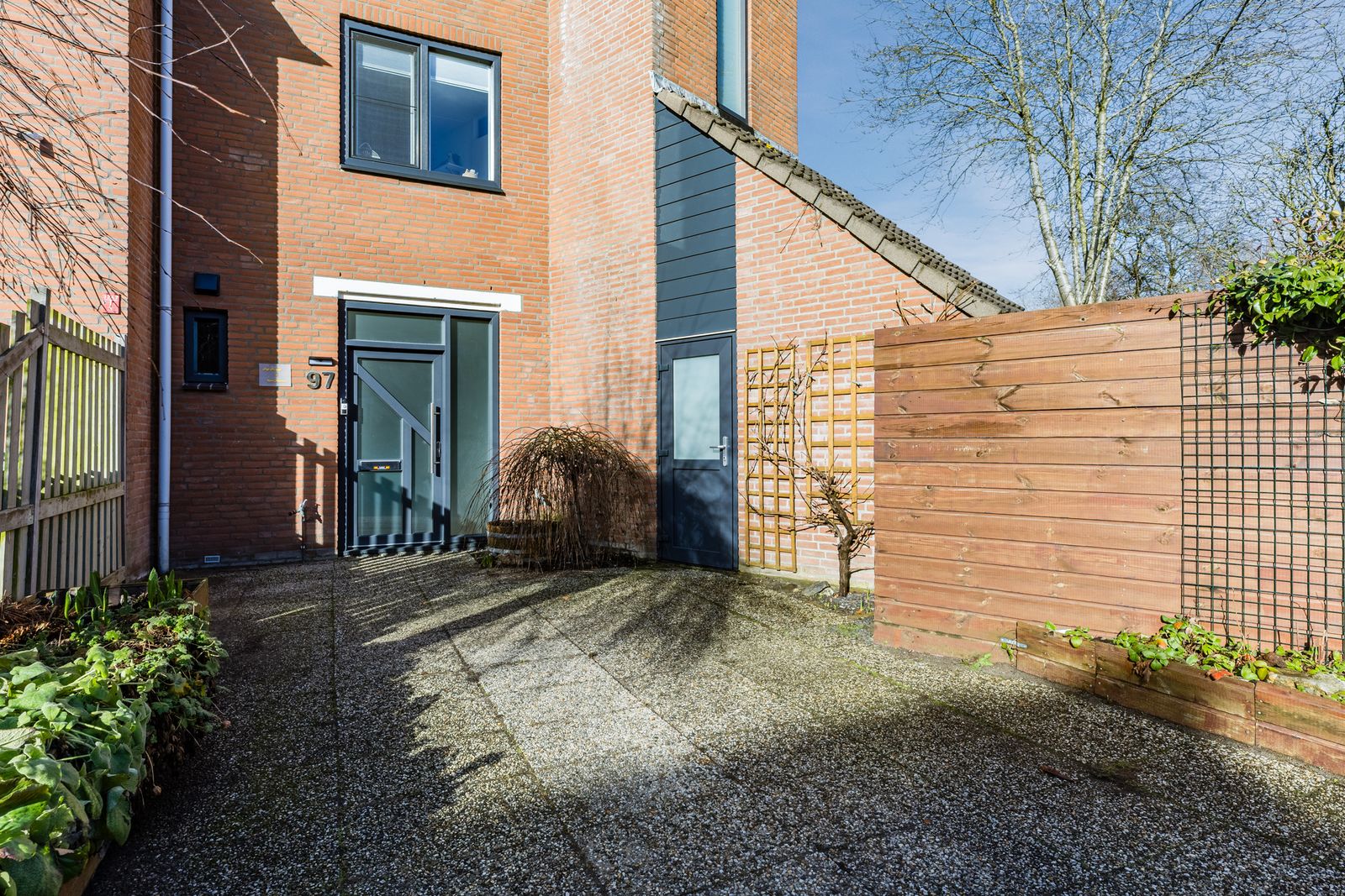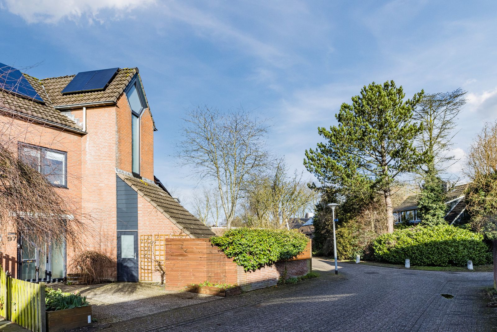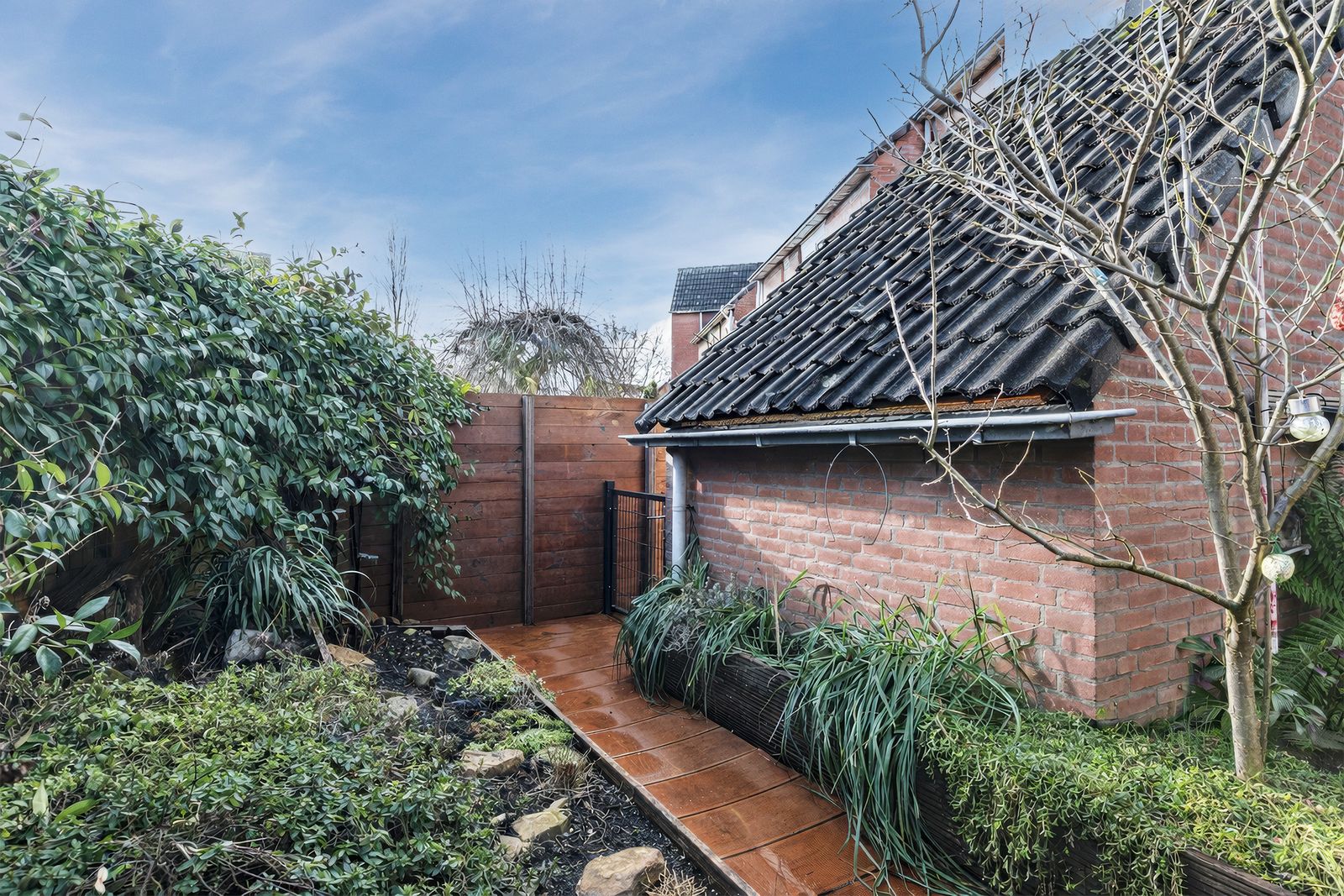 Aan de voorzijde een groene, beschutte tuin met volledige privacy. Voor de avondzon kunt u terecht in de achtertuin (patio), die een doorgang heeft naar het achtergelegen hofje. Omdat alle achtertuinen van de omringende huizen op het hofje uitkomen is dit ideaal voor kinderen. Aan de voorzijde is een ruime oprit voor parkeren op eigen terrein en een aangebouwde berging.