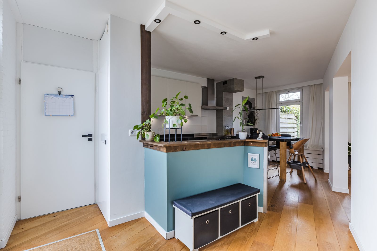 Entree met toilet, meterkast en toegang tot de woonkamer en keuken. Woonkamer heeft een schuifpui naar de voortuin, en een achterdeur naar de patio. De trapkast biedt handige bergruimte. Lichte, moderne keuken voorzien van diverse inbouwapparaten. Het werkblad is van Italiaans graniet is doorgetrokken in een ruime eettafel waardoor een gezellige eetkeuken is gecreëerd. De gehele begane grond is voorzien van een fraaie eikenhouten parketvloer.