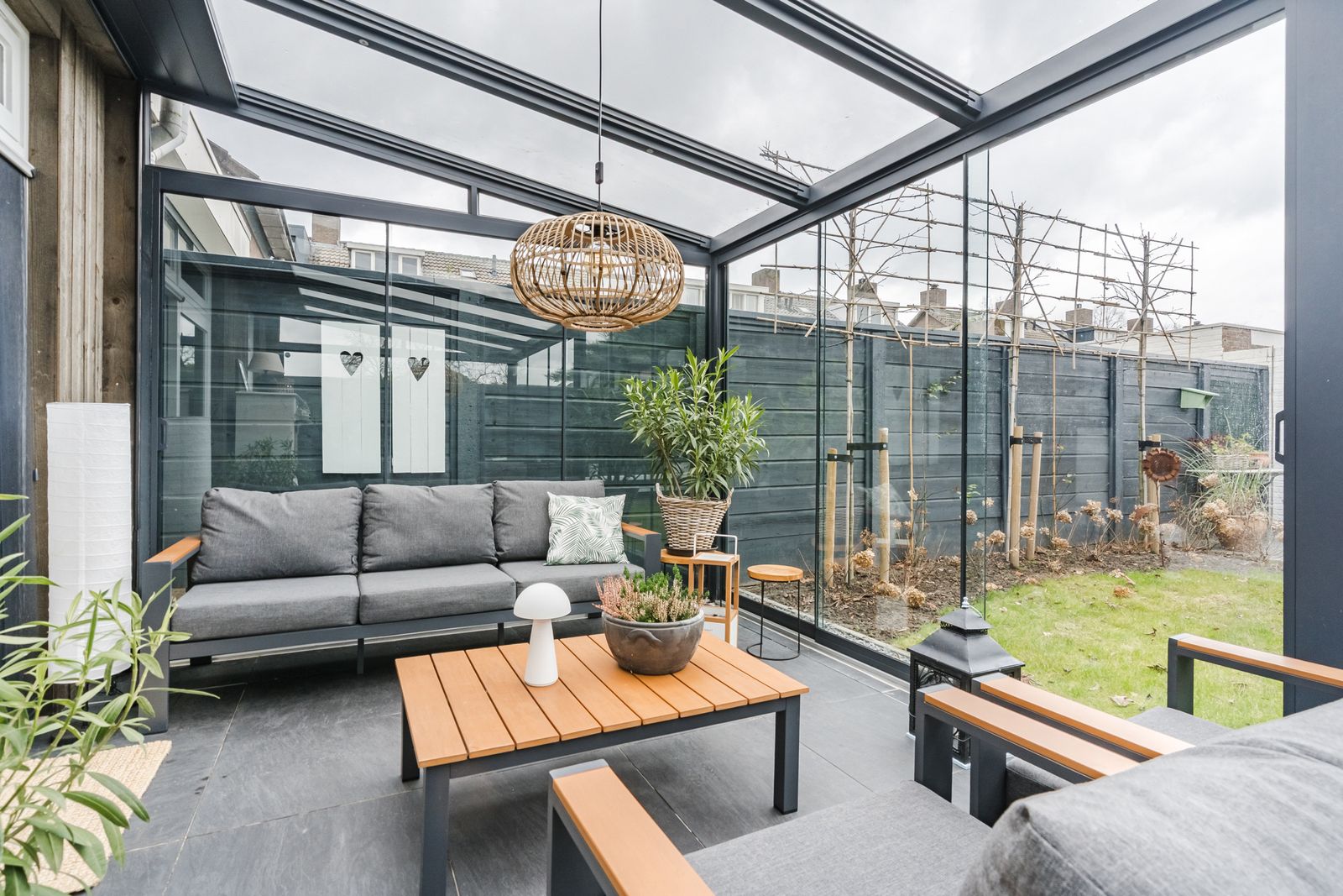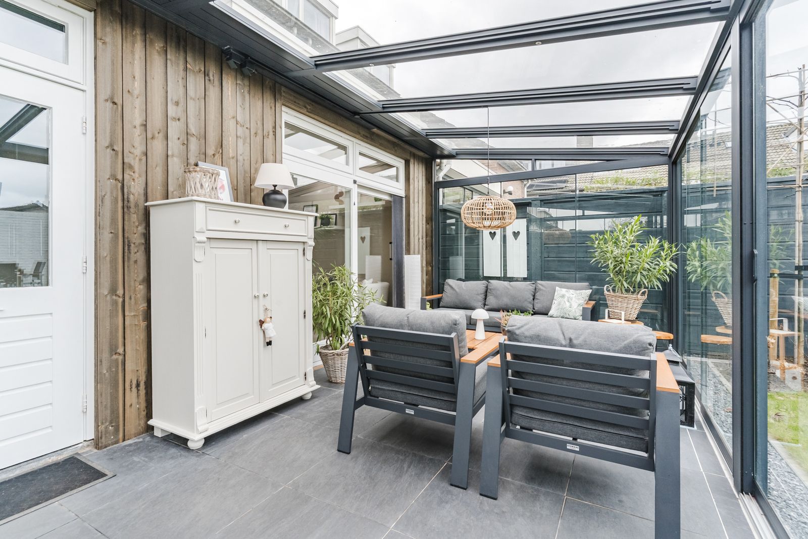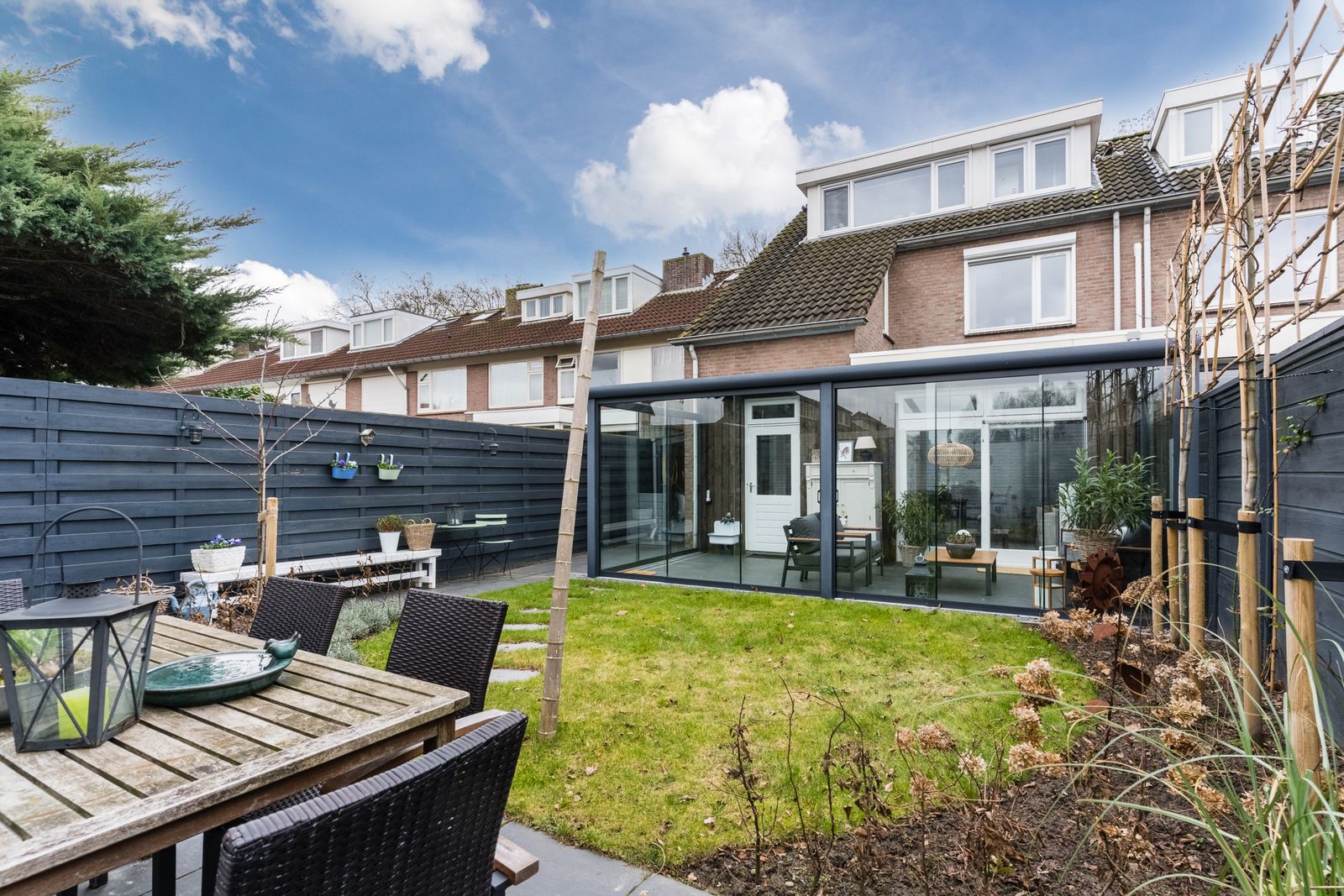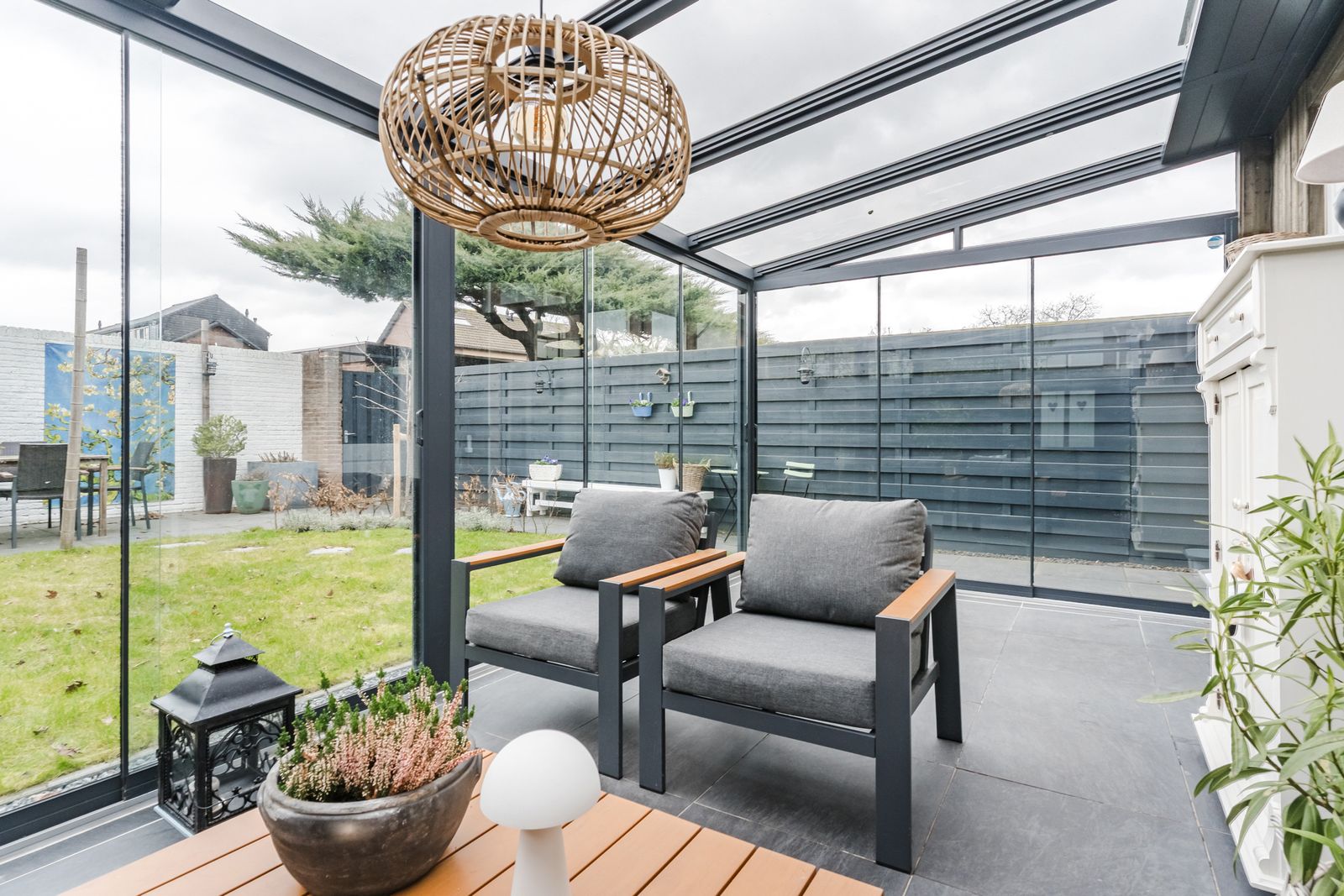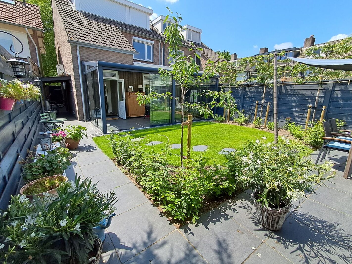 - Tuinkamer over de volle breedte van de woning met elektrische zonwering en glazen schuifpanelen