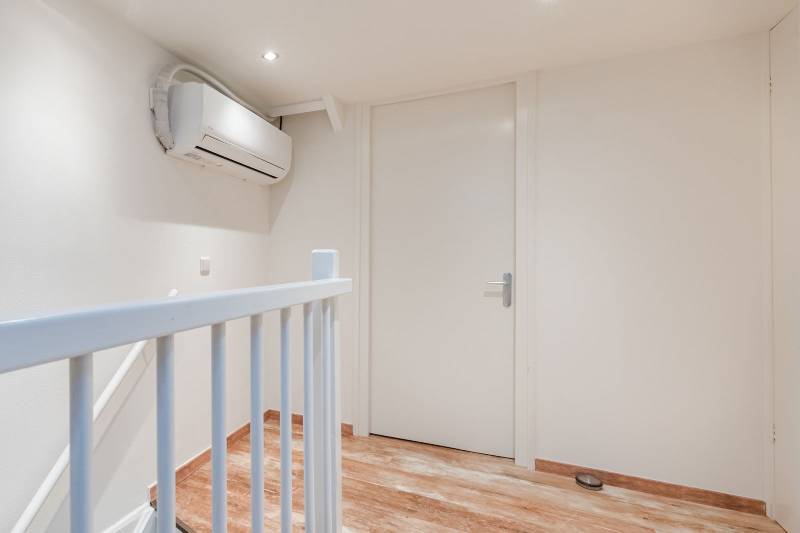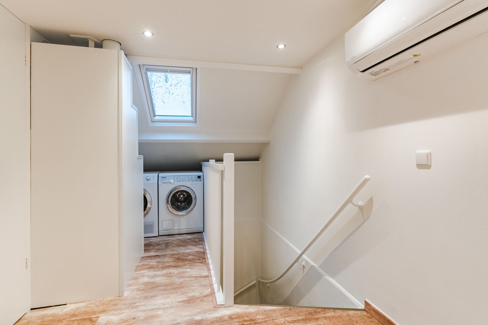 Royale overloop met aansluitingen van de witgoedapparatuur, de cv-ketel (Merk: Vaillant, bouwjaar: 2017), inbouwspots en de toegangsdeuren naar twee slaapkamers en kleine kamer die eventueel als kantoor/kleedruimte is te gebruiken. Overloop is voorzien van een Velux dakraam. Er is tevens een airco aanwezig (2017) welke kan koelen en verwarmen.