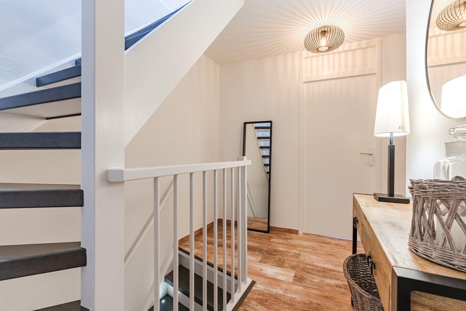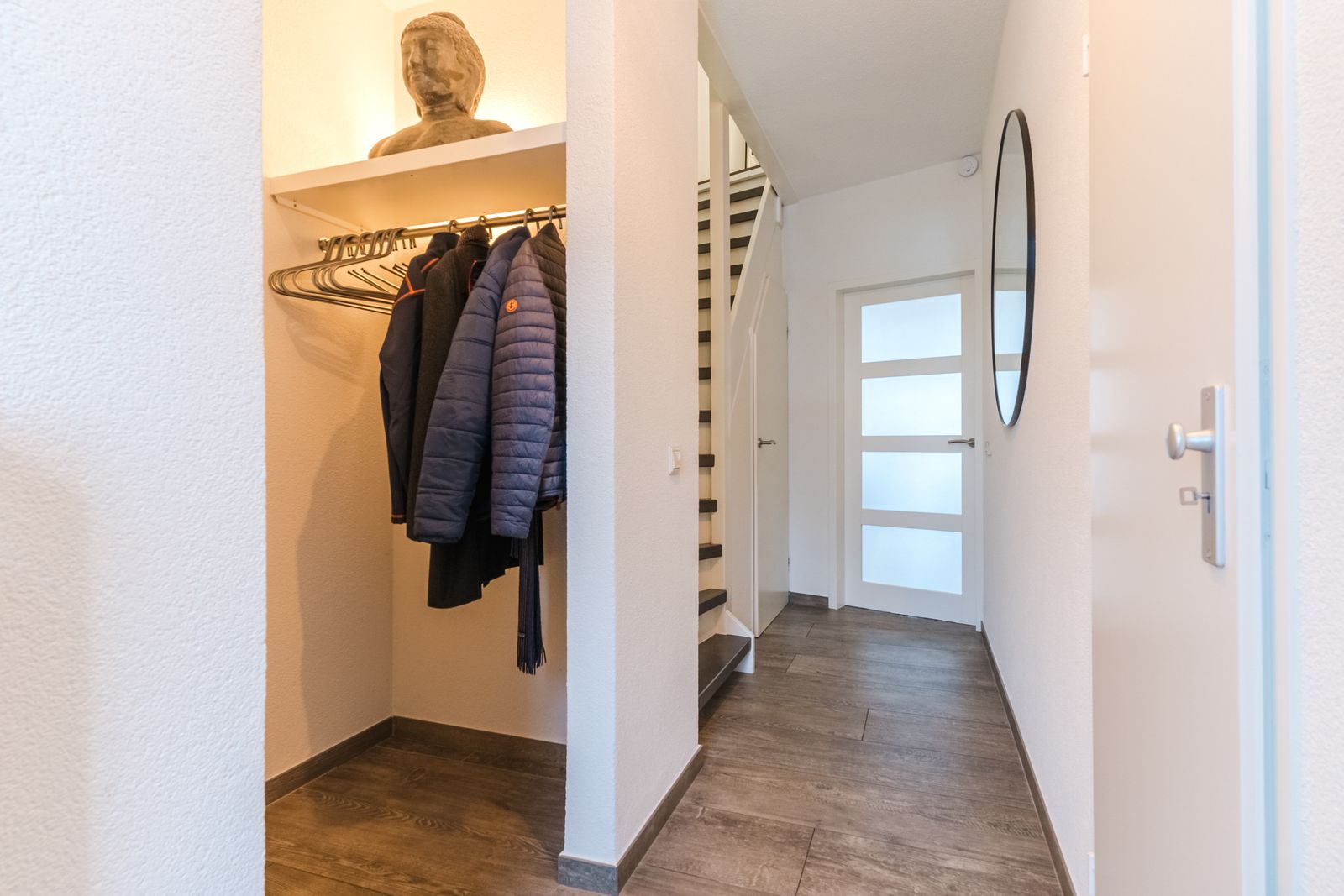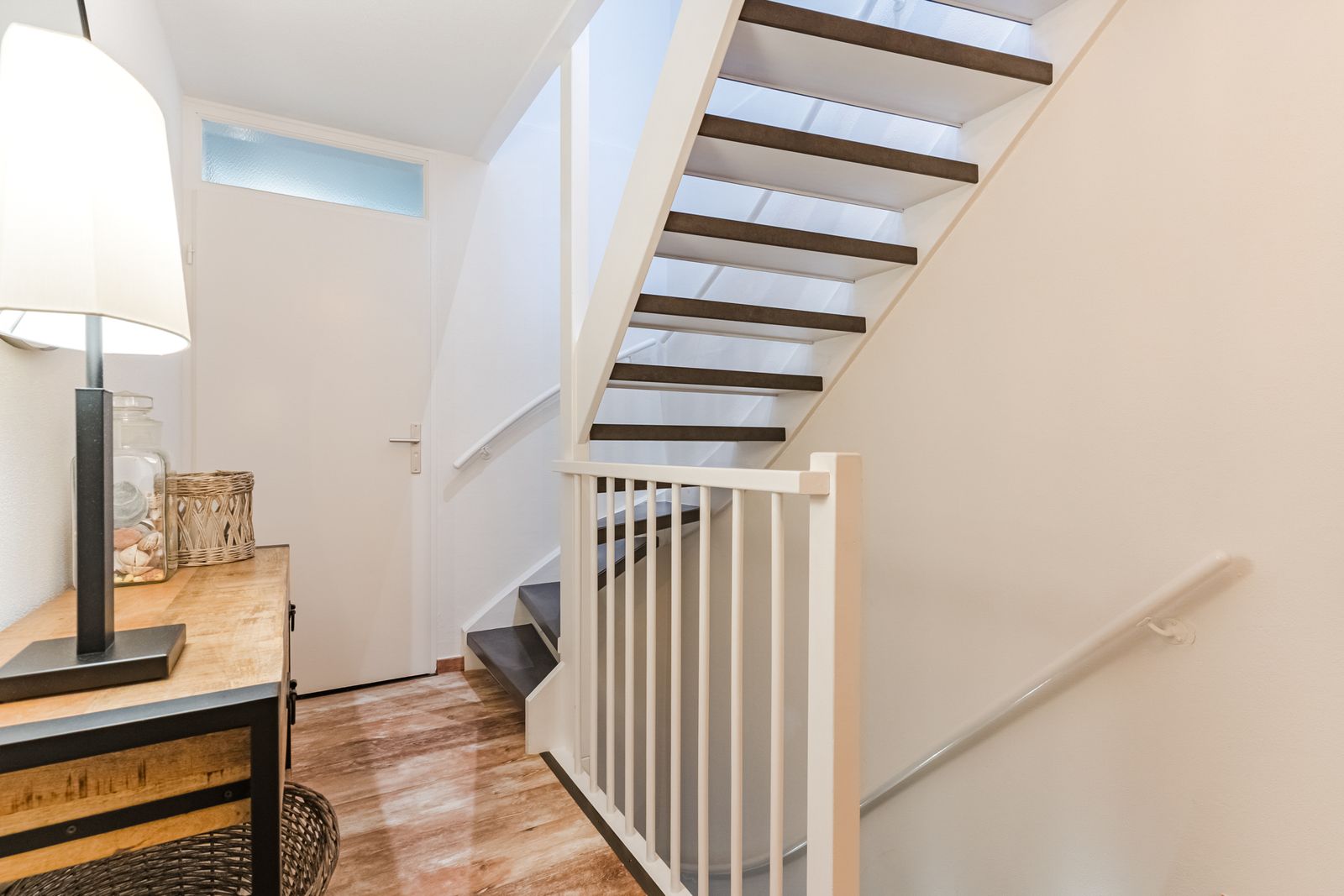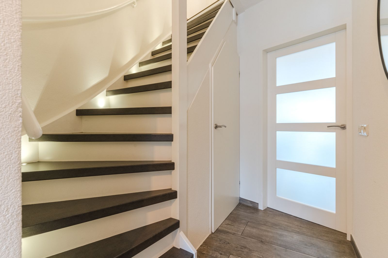 Entrance / hall with renewed meter cupboard, the toilet, the staircase to the first floor with stair tread lighting, stair cupboard and access door to the living room.