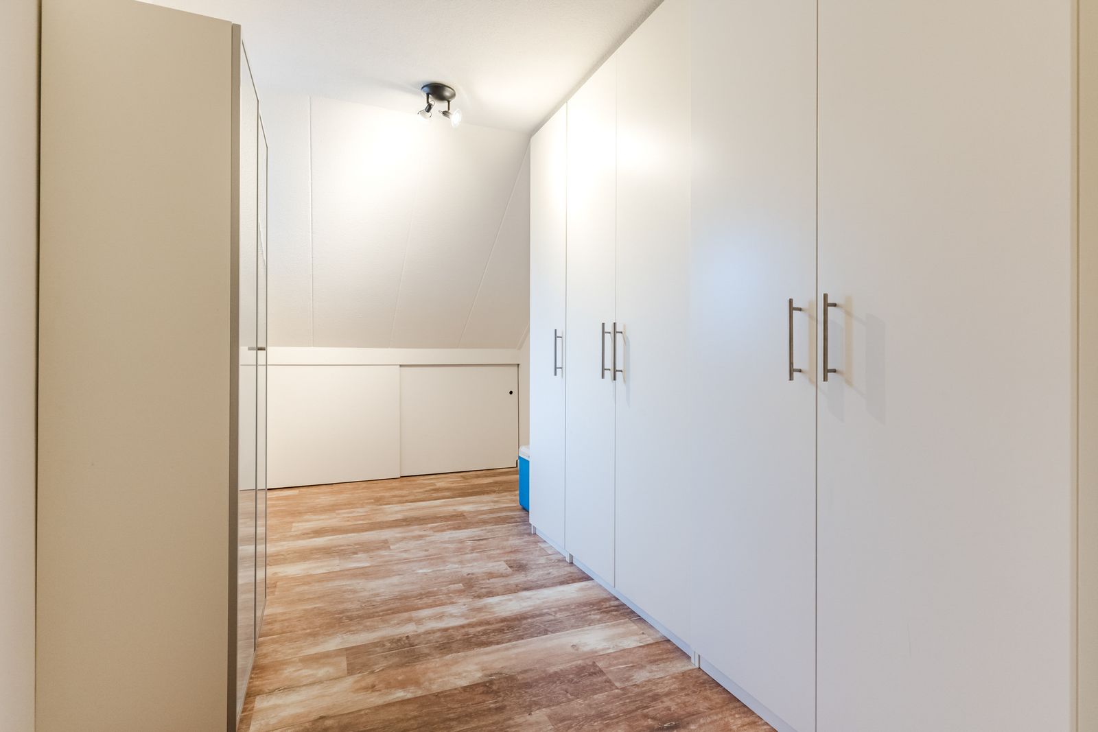 Aan de achterzijde gelegen slaapkamer (4.49 x 2.34 m) met houten kozijn, dubbele beglazing en laminaatvloer. In deze kamer heb je ook de beschikking over een grote praktische bergruimte achter de knieschotten met schuifdeuren.