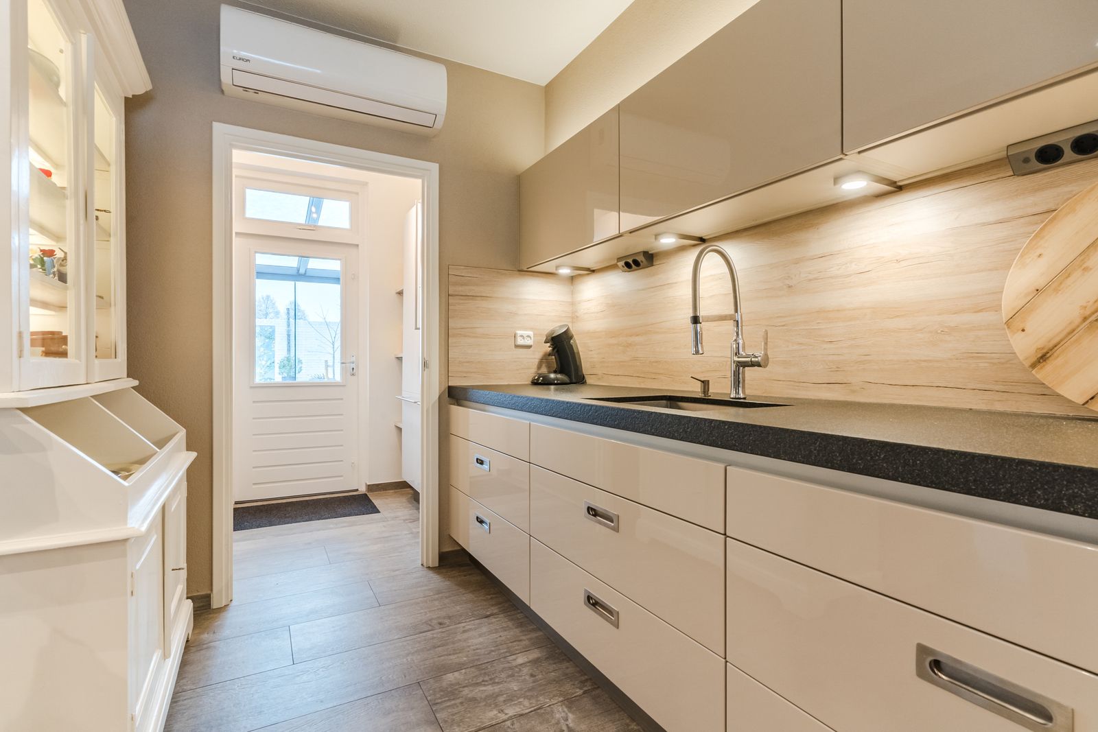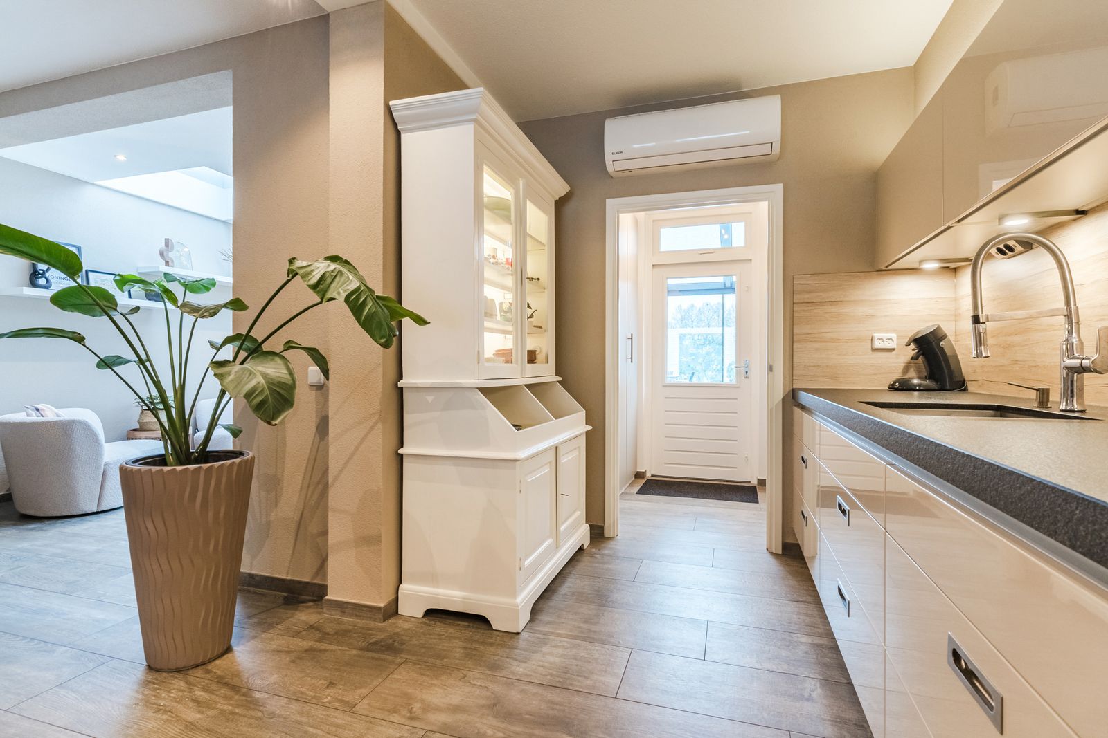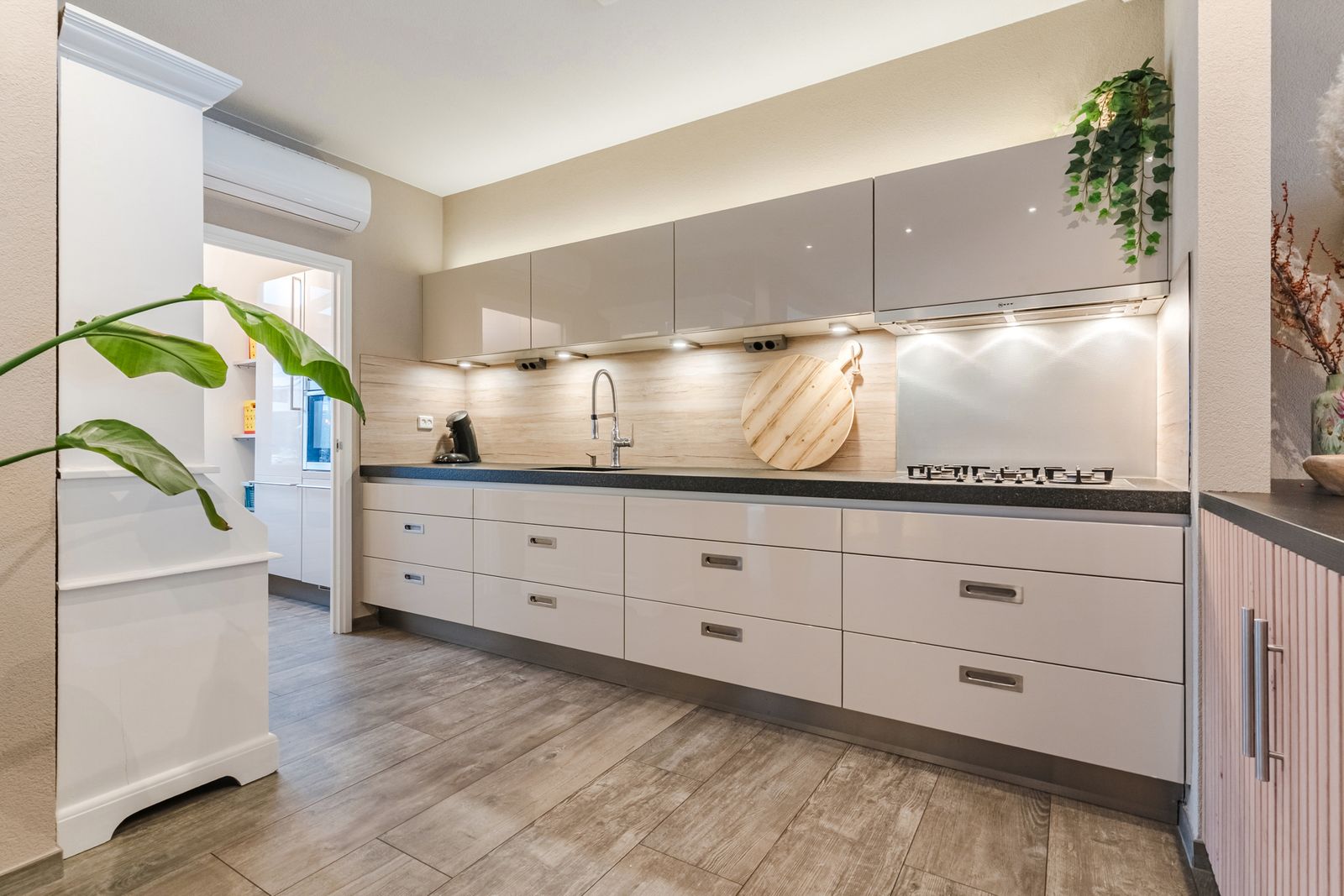 Open keuken in wandopstelling welke doorloopt in de bijkeuken. De keuken (merk; Poggenpohl) is voorzien van hoogglans fronten en is netjes onderhouden. Er is diverse inbouwapparatuur aanwezig zoals: 5-pits gaskookplaat, afzuigkap, vaatwasser en boiler voor warm water. Daarnaast beschikt de keuken over een natuursteen aanrechtblad en een grote hoeveelheid opbergruimte in de diverse kasten en lades. De bovenkastjes zijn voorzien van ledverlichting, zodat u de keuken sfeervol kunt verlichten. Er is een airco aanwezig welke kan verwarmen of koelen wanneer u daar behoefte aan heeft (bouwjaar ca 2022).