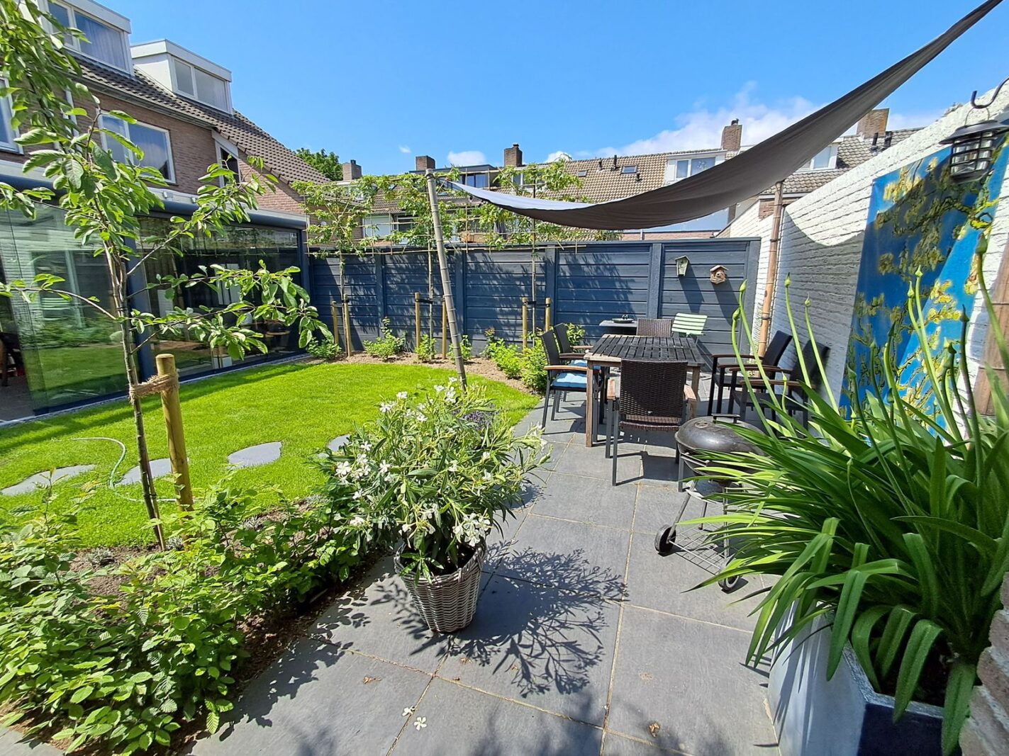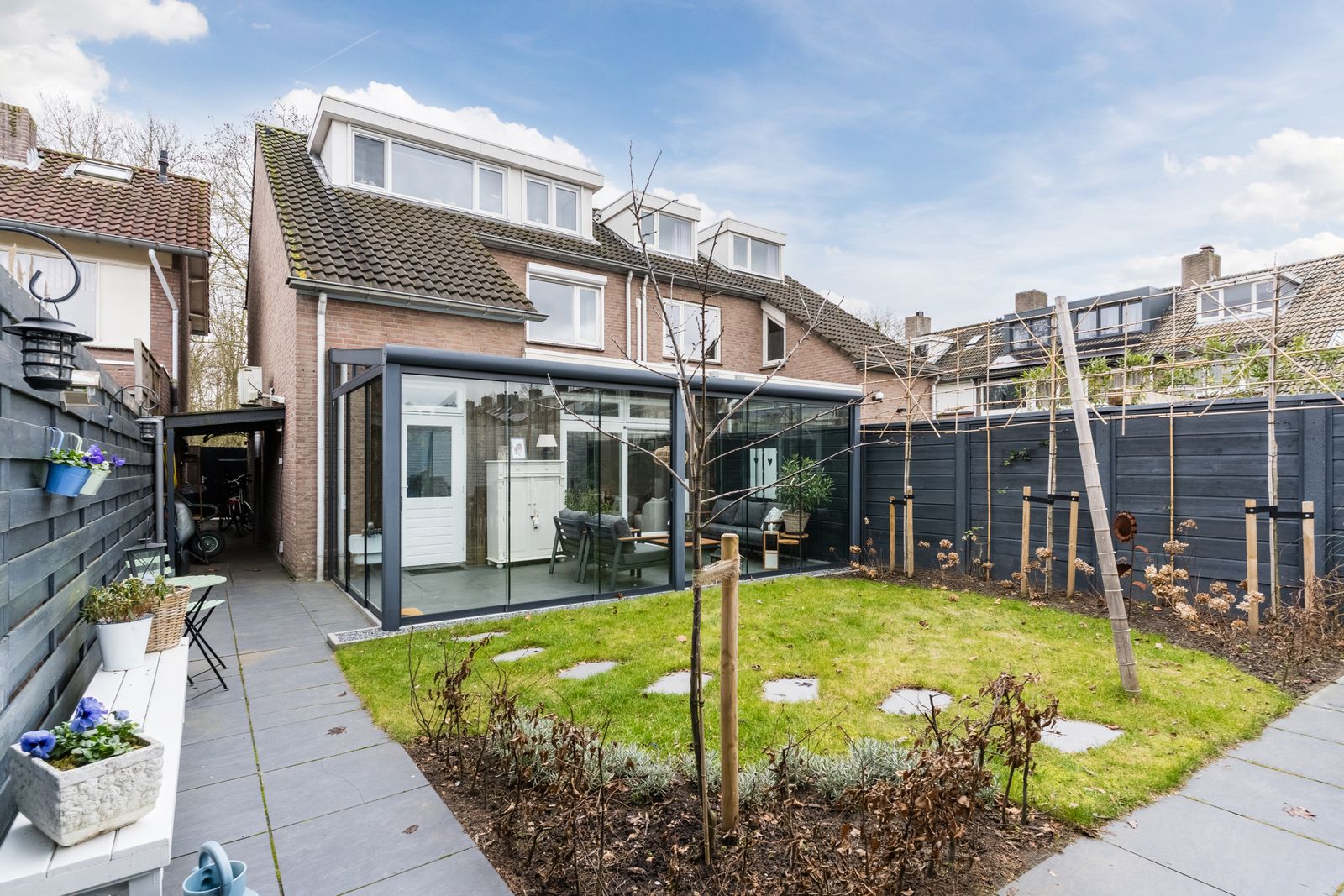 The backyard is located on the North-East. The low-maintenance backyard has a lawn with borders and modern garden tiles. Espalier trees are placed here in 2025. The garden can be reached from the rear (garage side) as well as from the side of the house (front). The hallway next to the house is also partly equipped with a roof and a lockable gate.