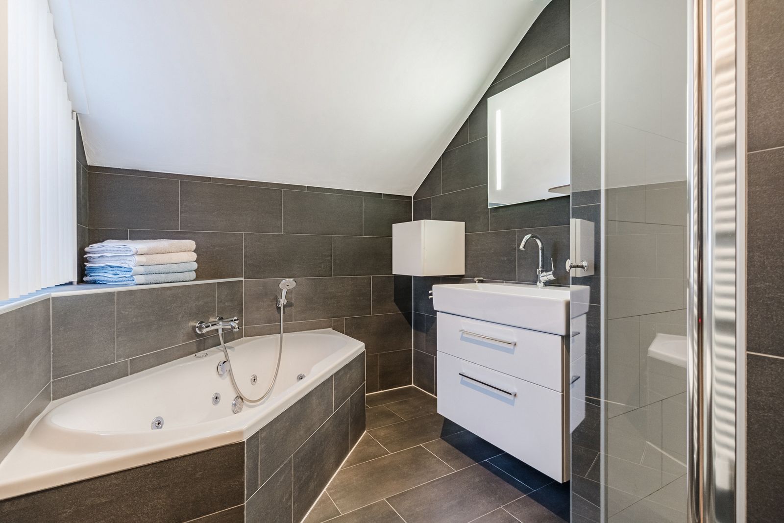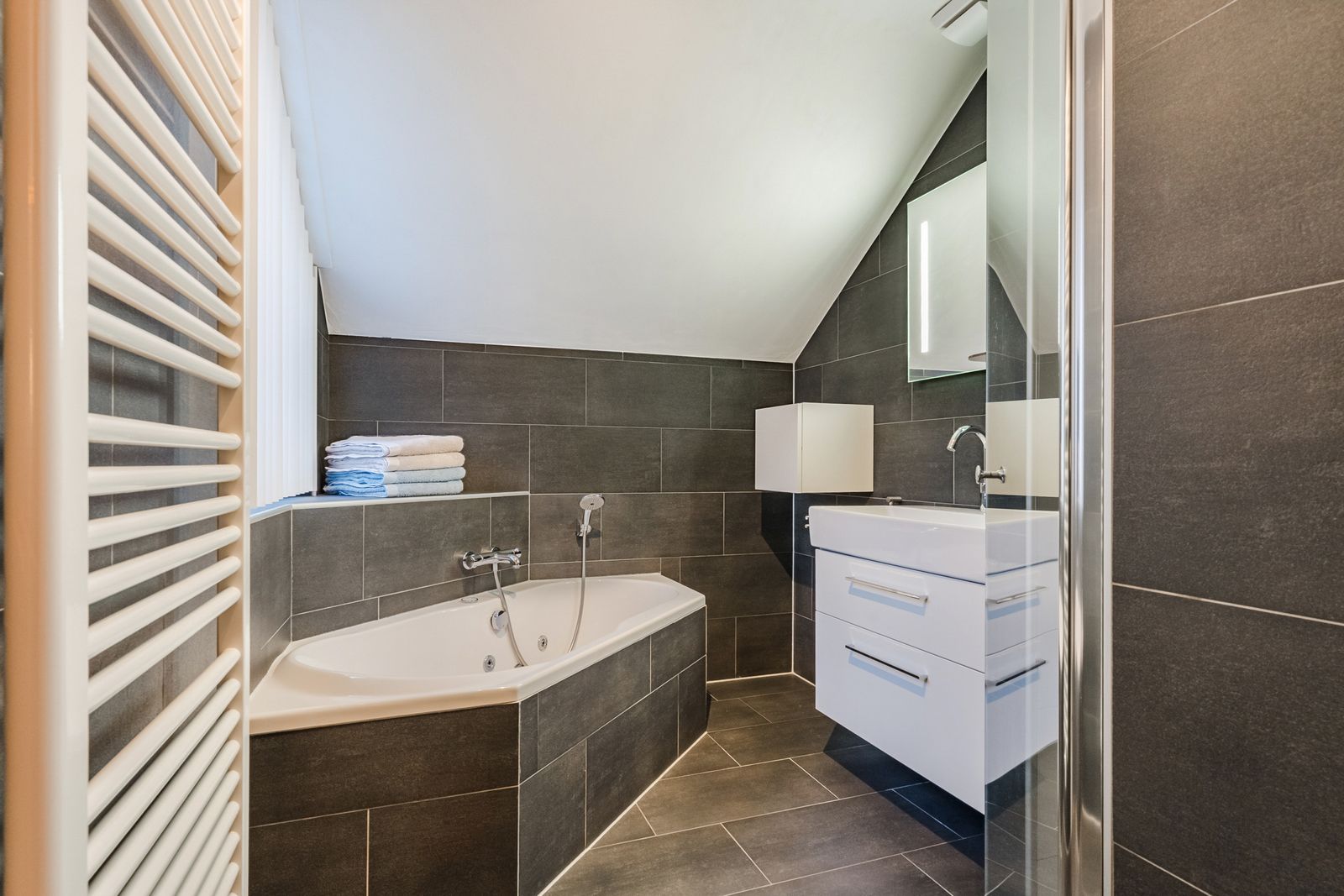 Aan de voorzijde gelegen badkamer welke van alle gemakken is voorzien zoals: douche met cabine, wastafelmeubel, spiegel met verlichting, handdoekenradiator en whirlpool-ligbad. De badkamer is afgewerkt met tegelwerk in neutrale kleurstelling en in zeer nette staat van onderhoud. Tevens is de badkamer voorzien van een raam (voor daglicht) en mechanische ventilatie.