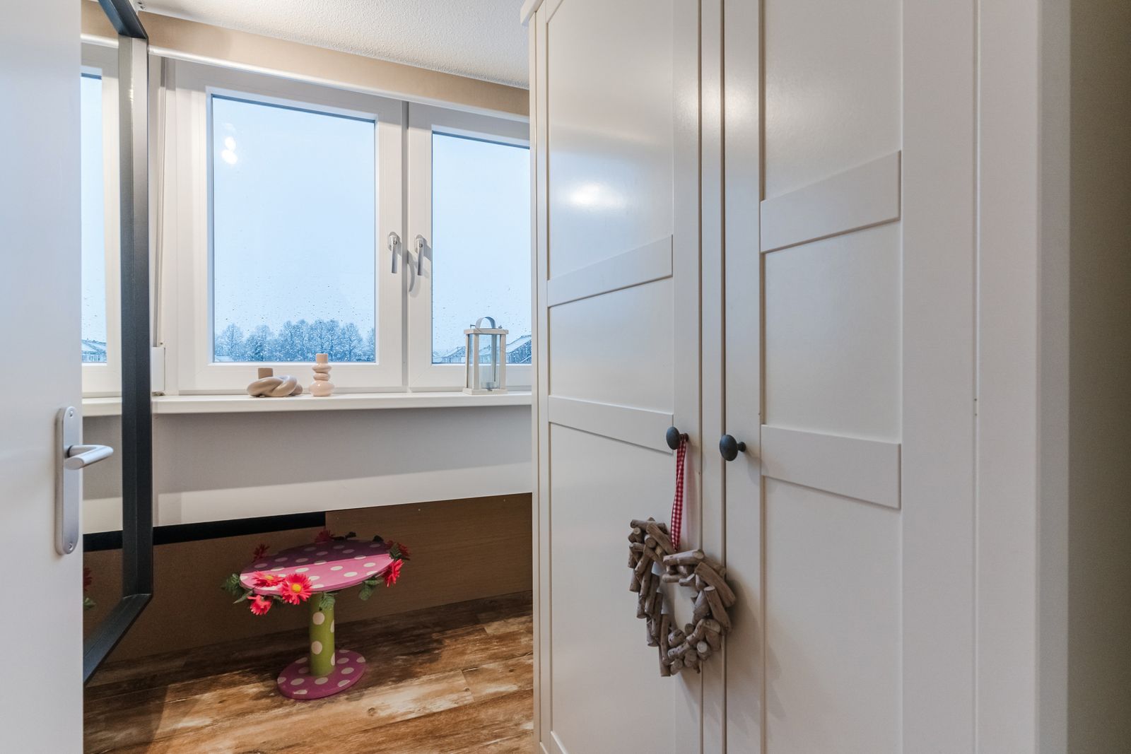 Office/ changing room (1.76 x 2.10 m) with dormer window and equipped with a plastic frame and a roller shutter. This space is currently used as a dressing room for bedroom 4, but could also be a study or hobby room. There is plenty of daylight