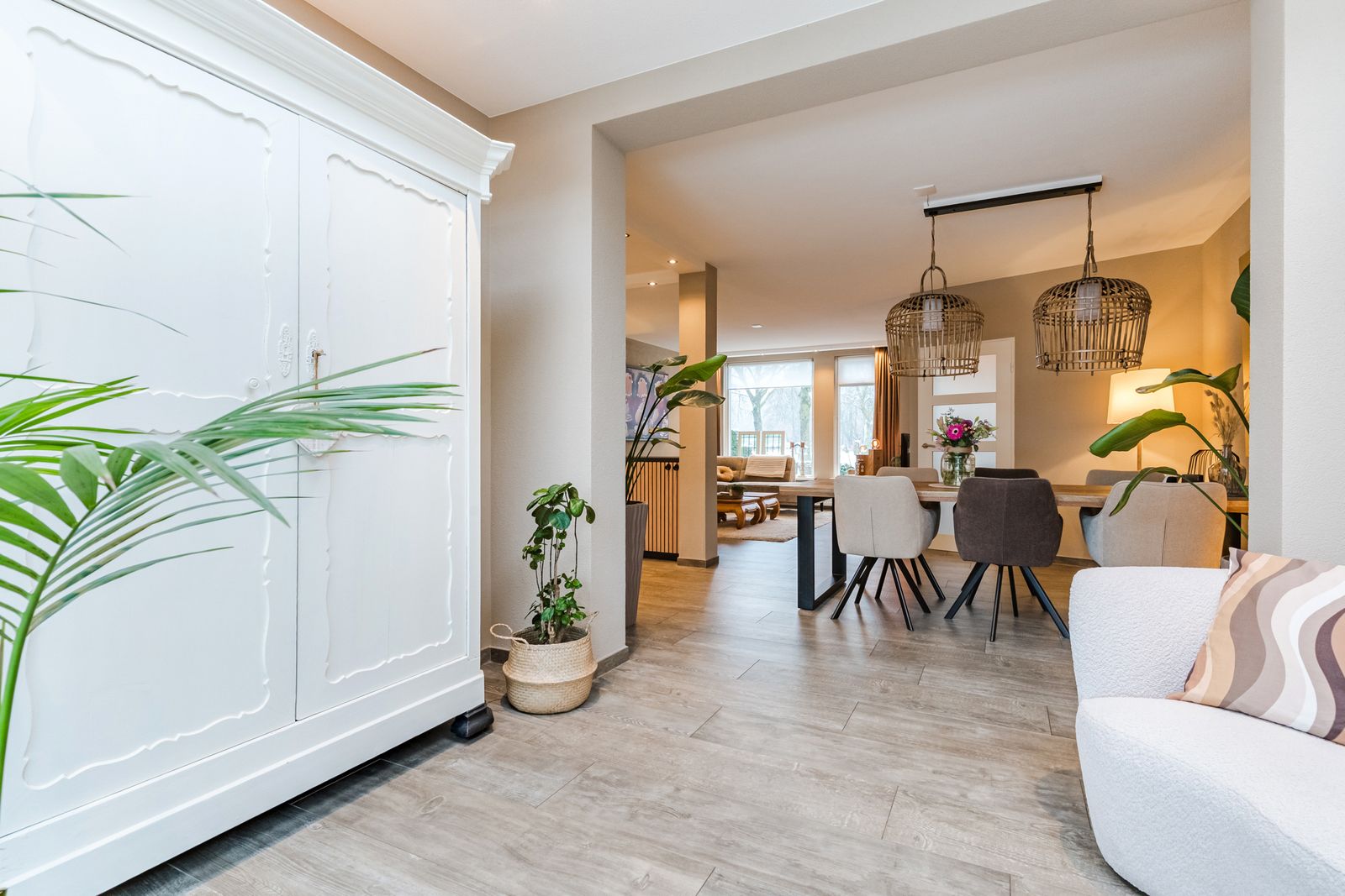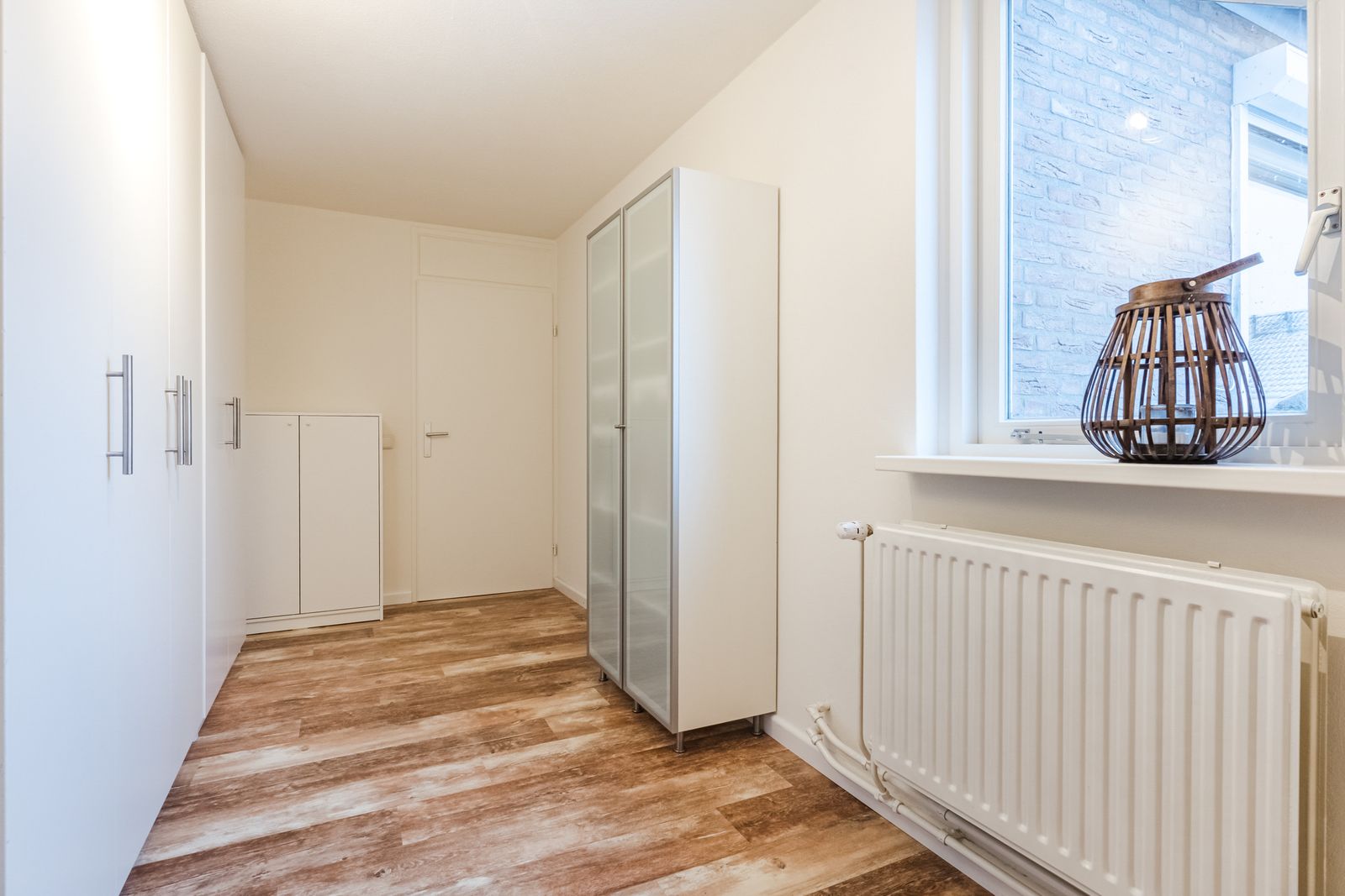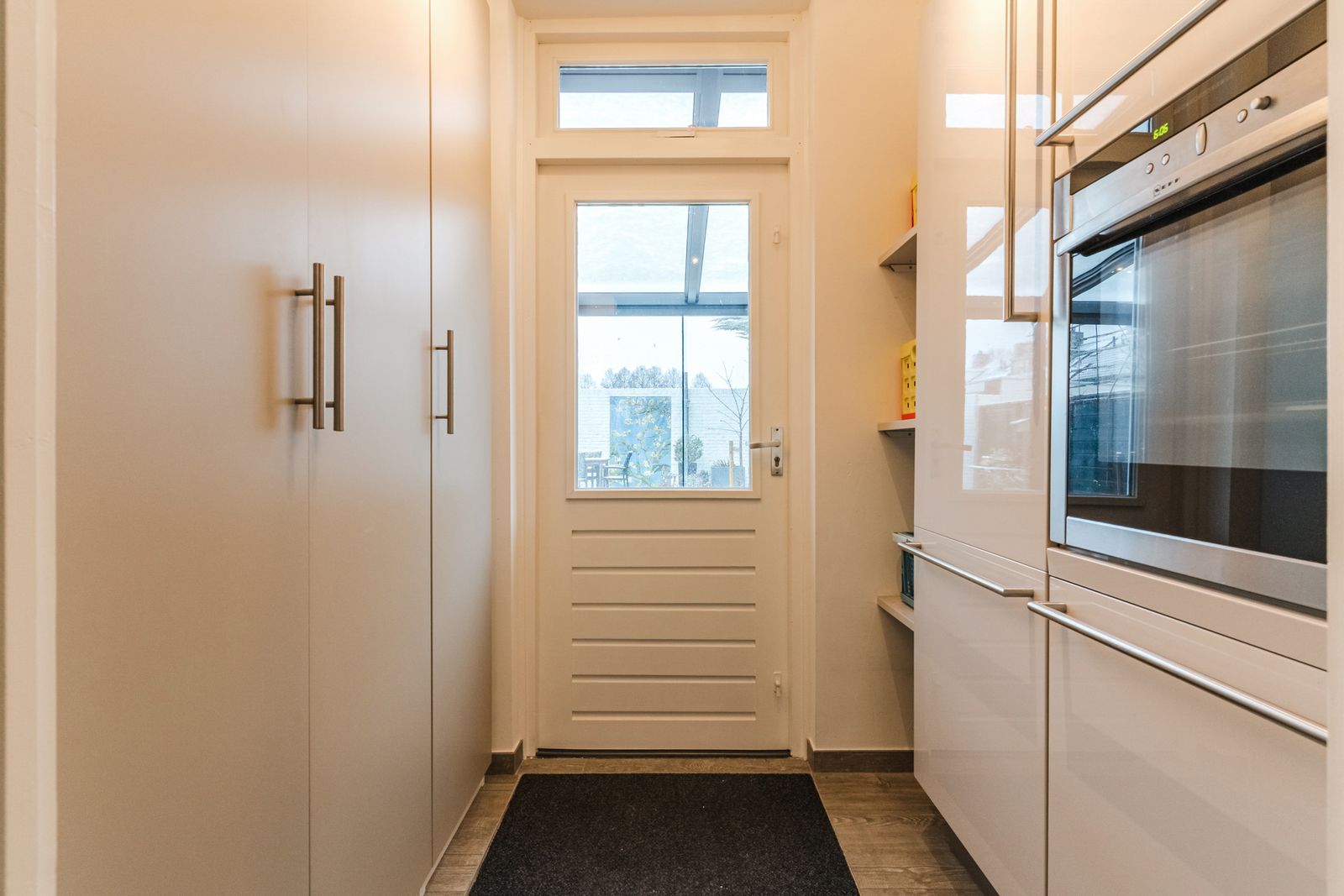 The kitchen partly continues into the utility room, but can be closed off if desired. On one side is a built-in wall cabinet with built-in oven with steam function and a fridge / freezer combination. On the other side there is a built-in wall cupboard that offers plenty of space for storage of supplies and the vacuum cleaner and ironing board.