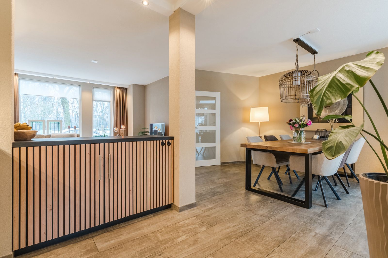 Very spacious living room with tiled floor in wood look (with underfloor heating). The large windows at the front of the house allow you to benefit from a large amount of light and a view over the park. The house has been extended at the rear and is equipped with skylights, recessed spotlights and sliding doors. You can create various seating areas here and, if desired, even a children's play area.