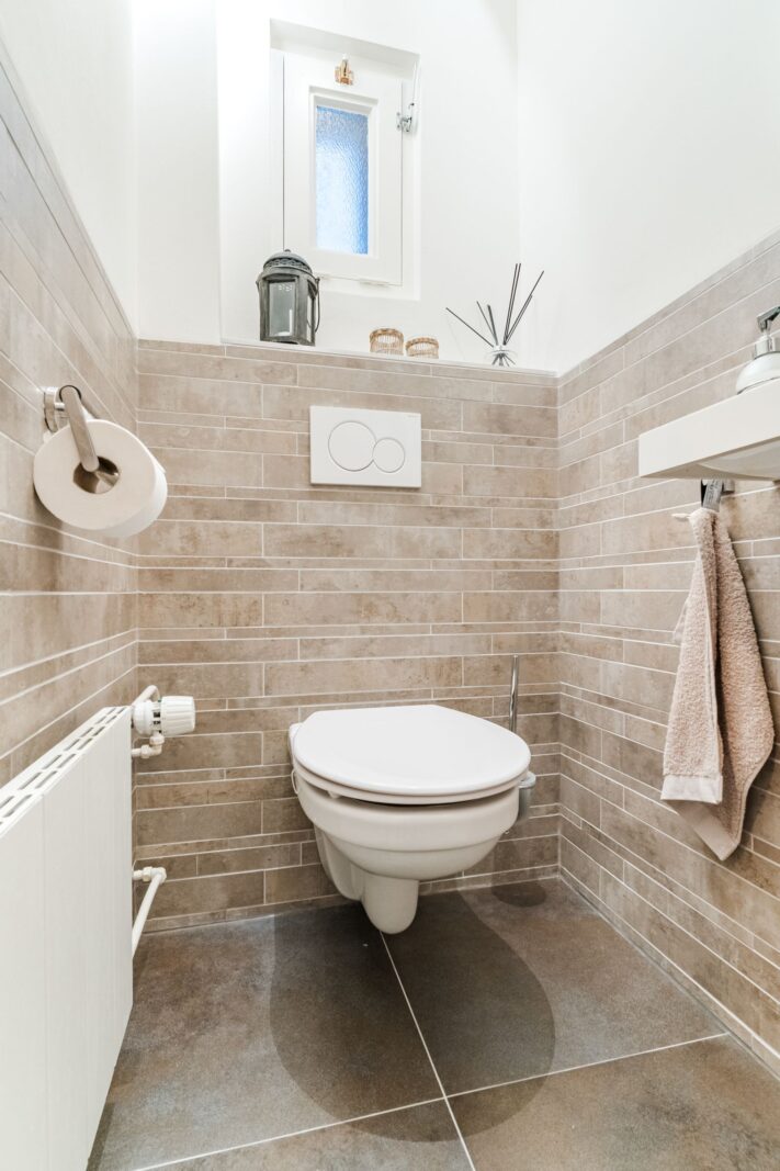Toilet room with free-hanging closet, fountain and radiator. The floor and walls have modern tiling. There is a window in the toilet room for natural ventilation and daylight.