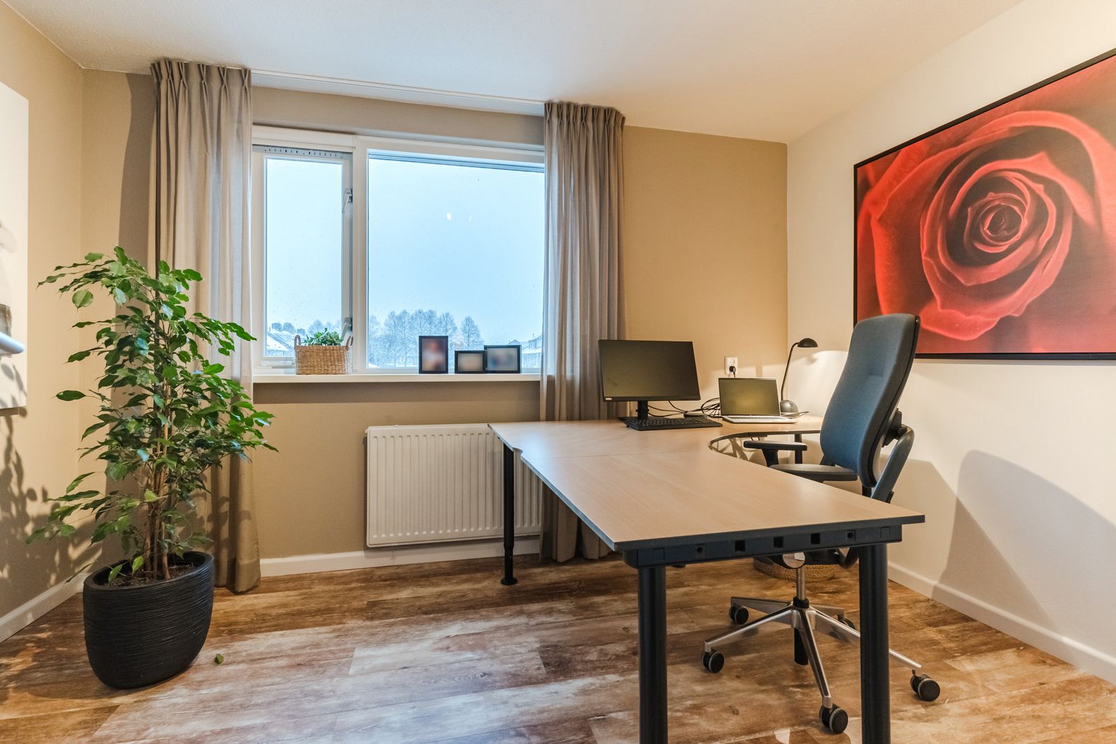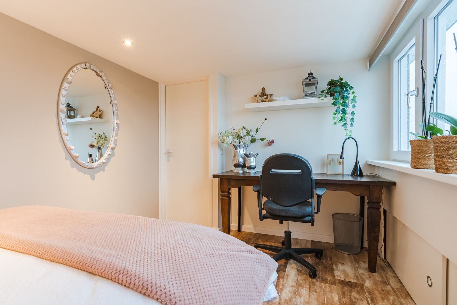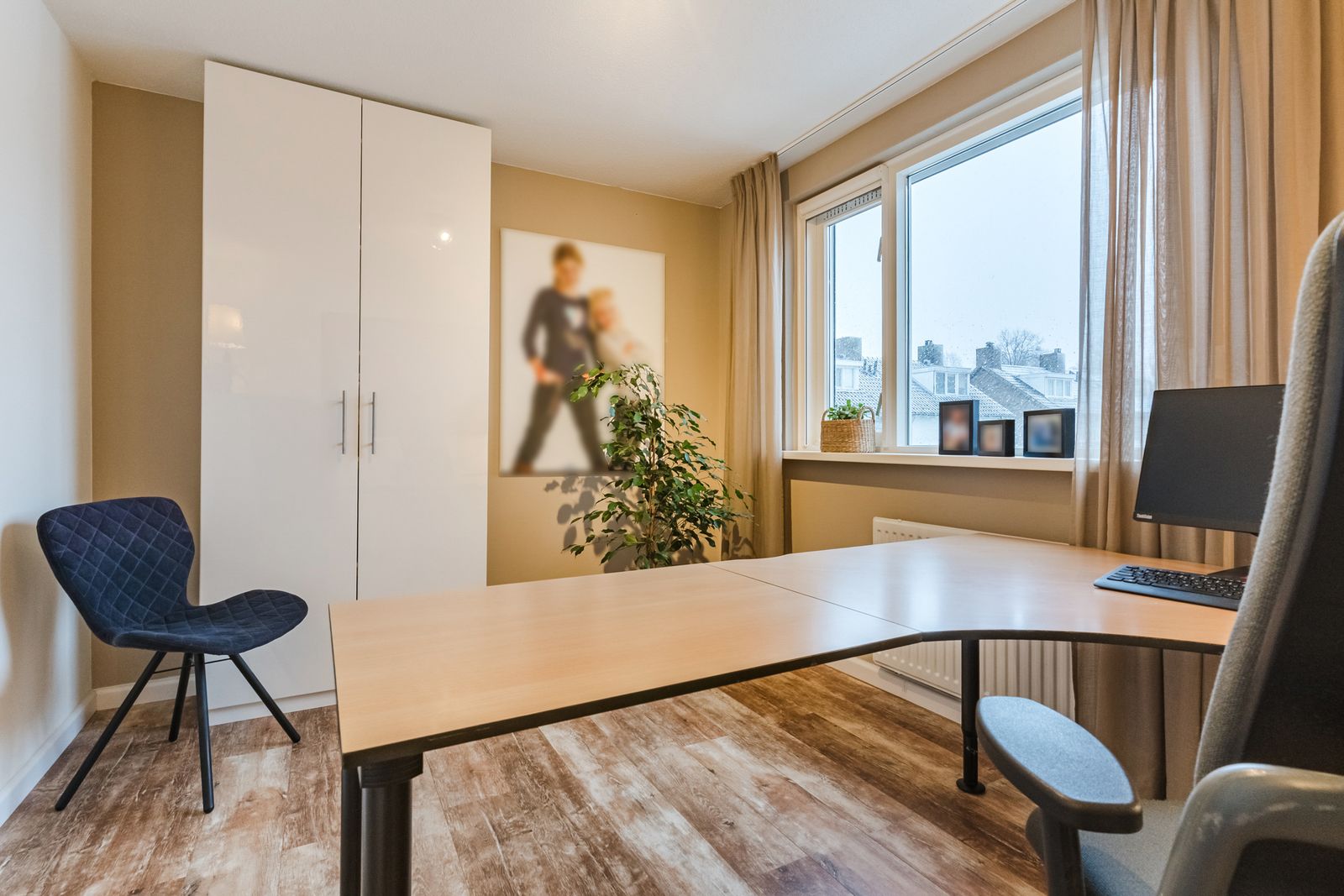 Kantoor-/ kleedruimte (1.76 x 2.10 m) met dakkapel en voorzien van een kunststof kozijn en een rolluik. Deze ruimte is momenteel in gebruik als kleedruimte voor slaapkamer 4, maar zou ook een studie of kantoorruimte kunnen zijn. Er is veel daglicht aanwezig.