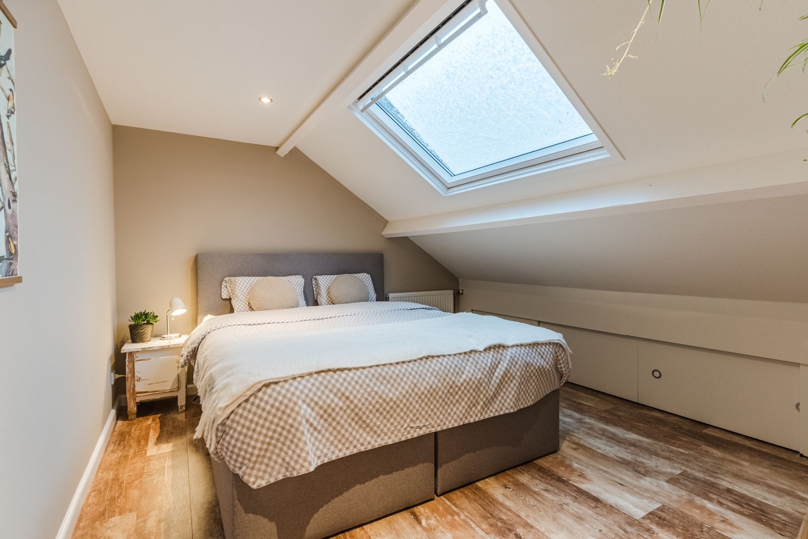 Bedroom located at the front (3.16 x 3.77 m) with plastic Velux skylight (with electric blinds), laminate flooring, recessed spotlights and also a large storage space behind the sliding wardrobes.