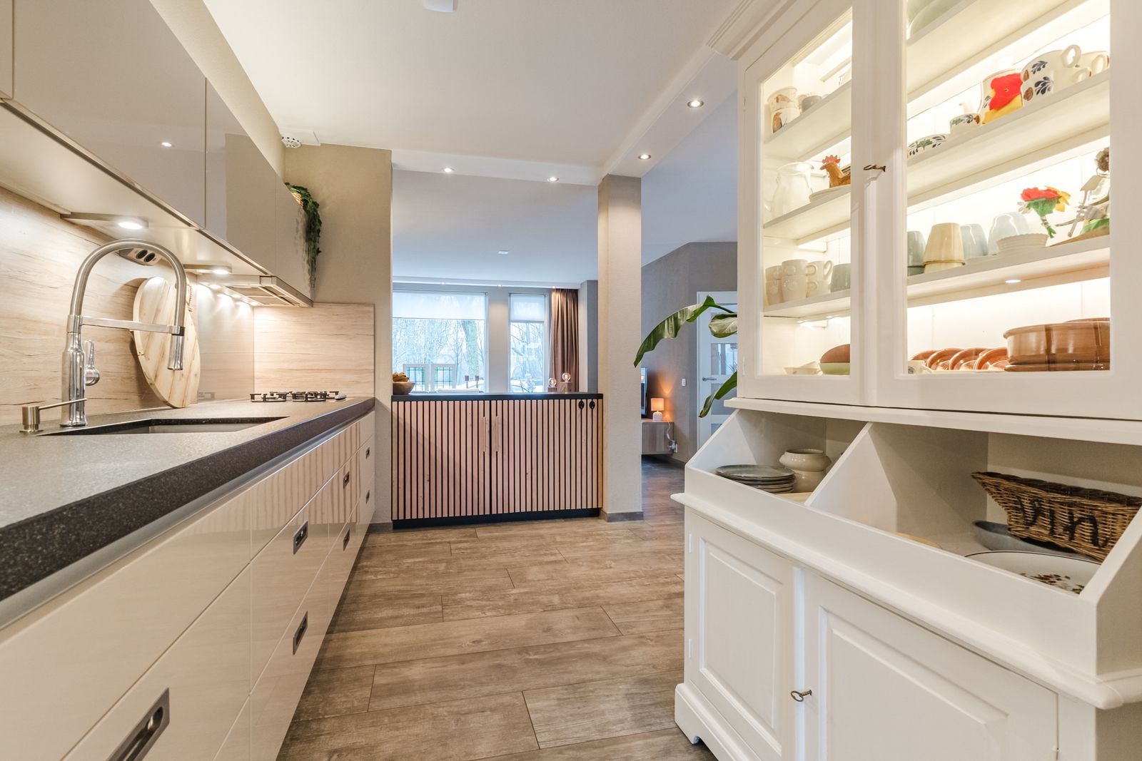 De keuken loopt deels door in de bijkeuken, maar is indien gewenst af te sluiten. Aan één zijde is een ingebouwde wandkast aanwezig voorzien van ingebouwde oven met stoomfunctie en een koel/ vries combinatie. Aan de andere zijde is een ingebouwde wandkast aanwezig die veel ruimte biedt voor opslag van voorraden en de stofzuiger en strijkplank.