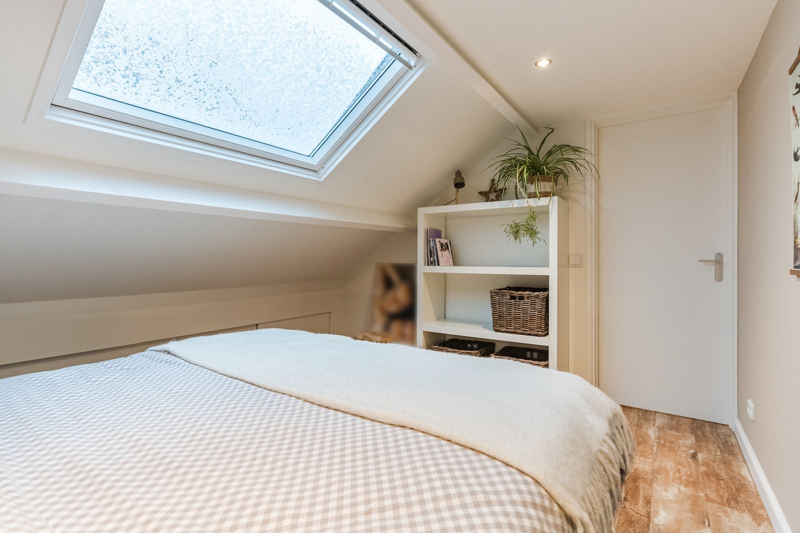 Aan de voorzijde gelegen slaapkamer (3.16 x 3.77 m) met kunststof Velux dakraam (voorzien van elektrische zonwering), laminaatvloer, inbouwspots en eveneens een ruime bergruimte achter de schuifwand.