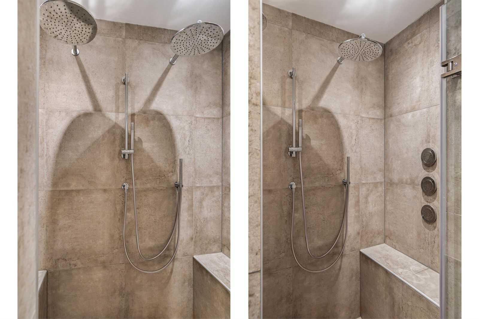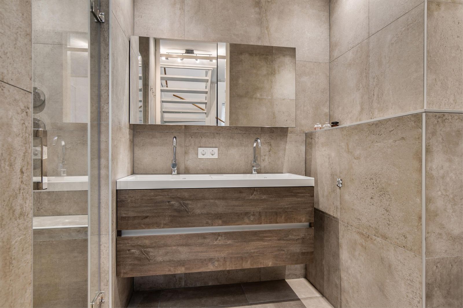 When you go upstairs with the stairs, you will find a landing with three spacious bedrooms and the bathroom with a toilet. The master bedroom has air conditioning and a large wardrobe. The bathroom is a modern bathroom with a large walk-in shower with two rain shower heads. There is also a large bathroom furniture with two sinks.