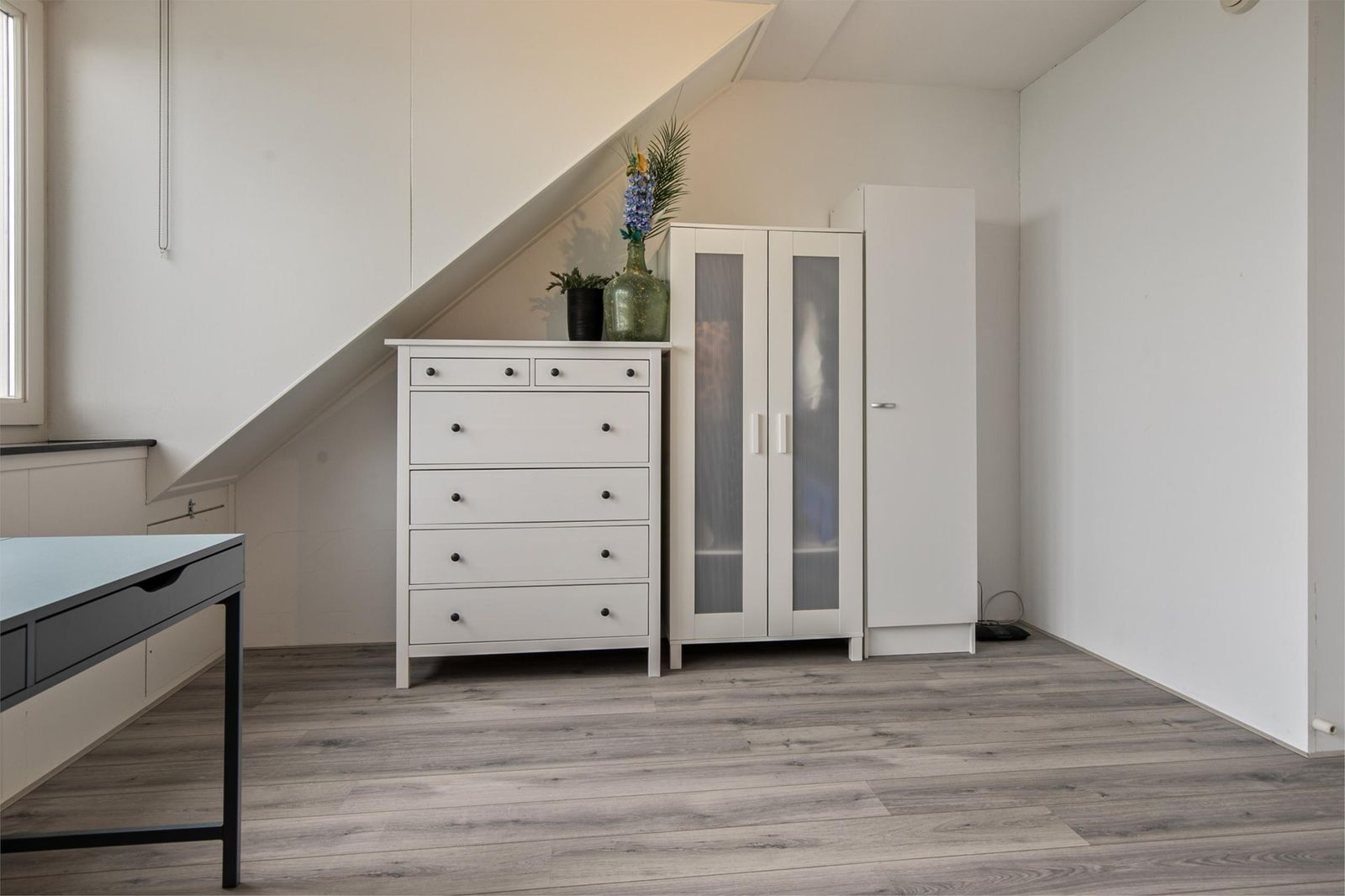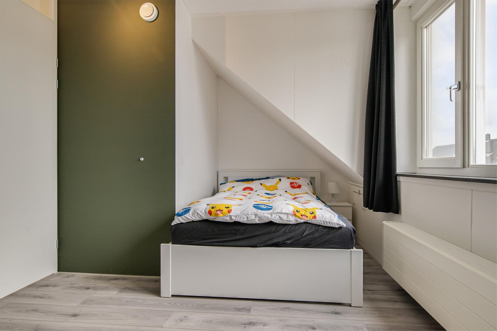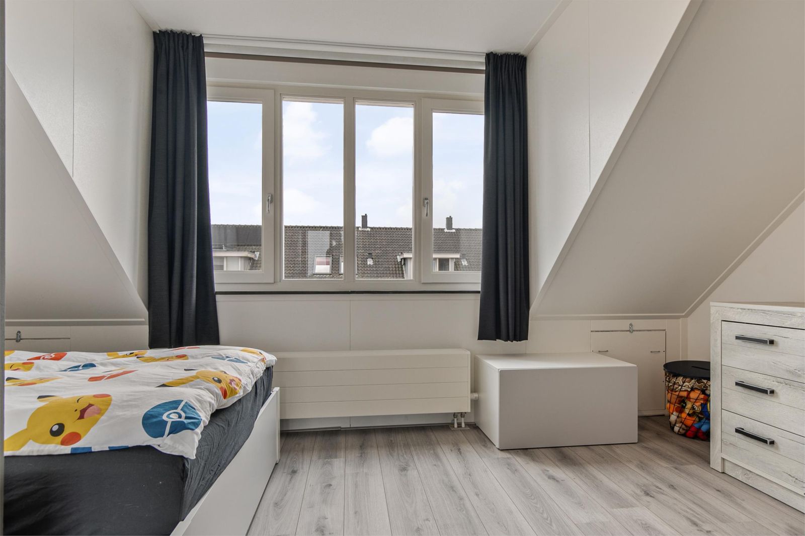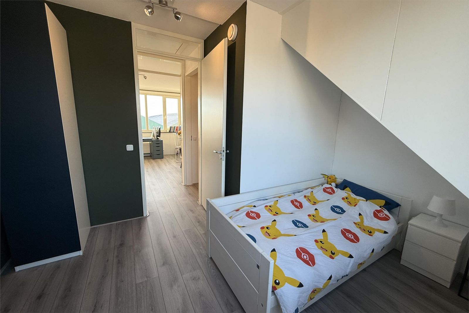 The stairs take you to the top floor. Here you will find two spacious bedrooms and a laundry room with a washing machine connection. On the first and second floor the heat comes through radiators and has its own thermostat. You can also use a loft ladder to the attic where you have extra storage space.