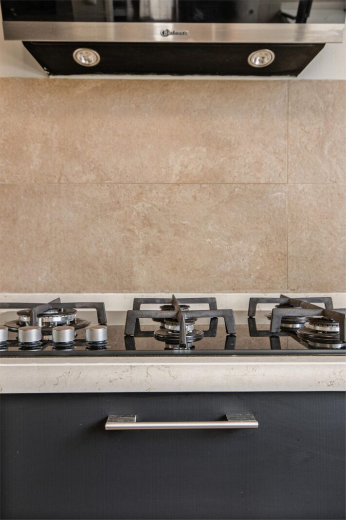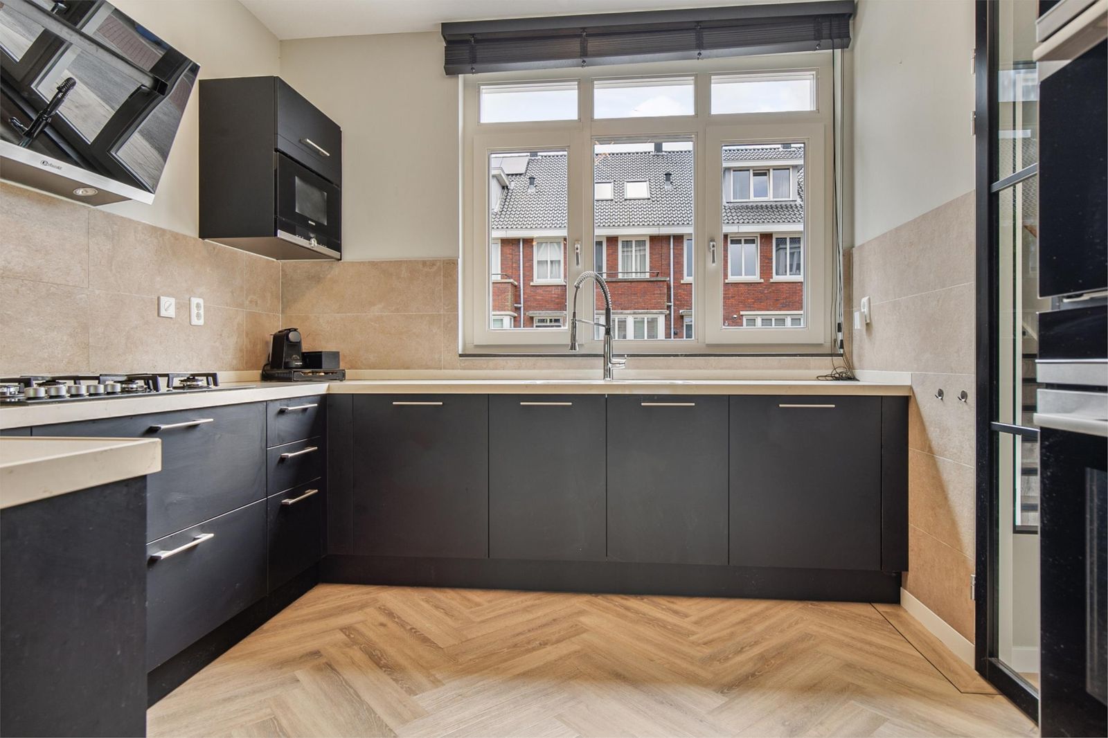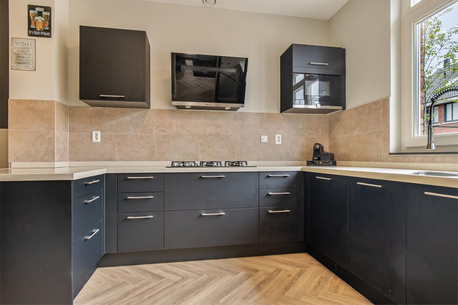 Via de voordeur komt u in de hal waar de meterkast, het toilet, de deur naar de woonkamer en de trap naar boven zich bevindt. Als u doorloopt naar de woonkamer komt u gelijk in de keuken. De keuken is uit 2017. De vloer in de gang loopt door op de gehele beneden verdieping. Dit is een pvc-vloer uit 2022. Ook heeft de volledige benedenverdieping vloerverwarming. De keuken is voorzien van inbouw apparatuur. Zo is er een vaatwasser, oven, stoomoven en magnetron.