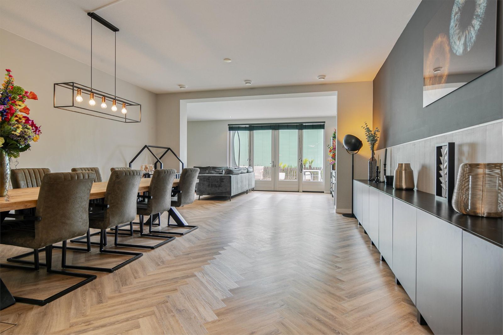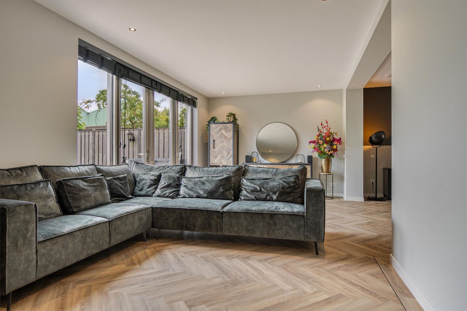 Als u doorloopt komt u in de eetkamer. De eetkamer is een riante doorloop naar de woonkamer. Door de uitbouw is er een zithoek gerealiseerd. Vanuit de woonkamer kunt u door openslaande deuren de tuin betreden. De tuin ligt op het Oosten.