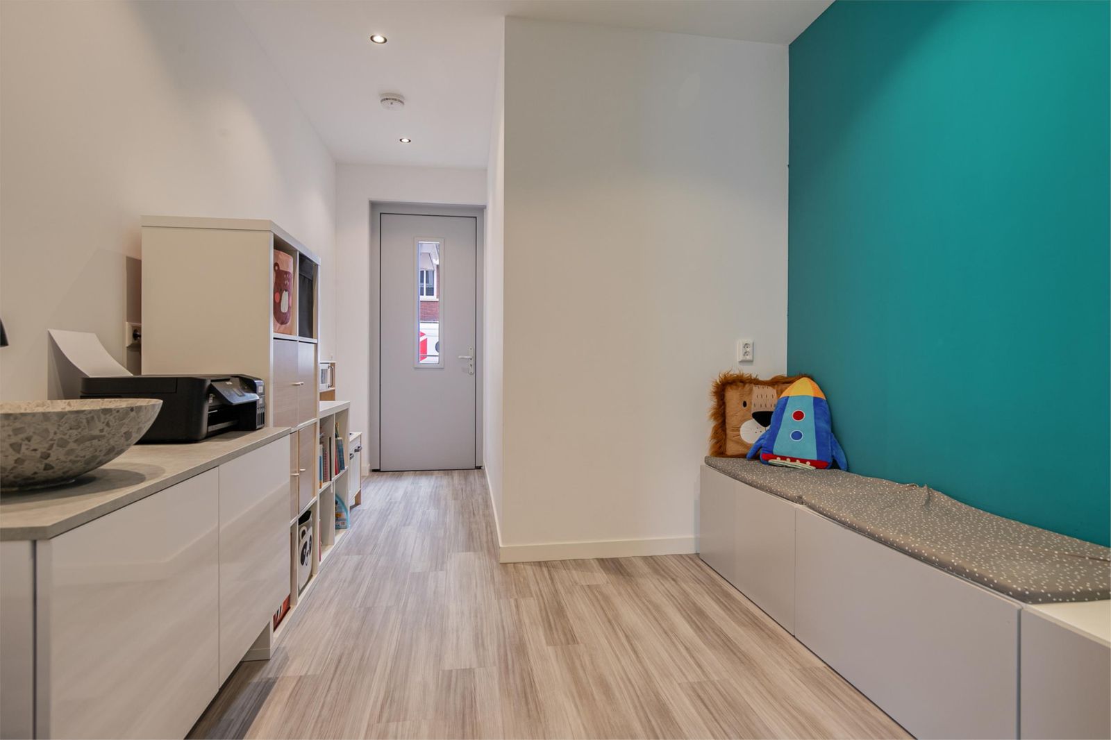 De garage in tweedelen gesplitst waardoor een praktijk aan huis mogelijk is met een aparte voordeur en een wastafel met zowel koud als warm water. De andere kant van de doorgebroken garage is een inpandige schuur met een stroompunt, voor het opladen van een elektrische scooter en/of fiets.