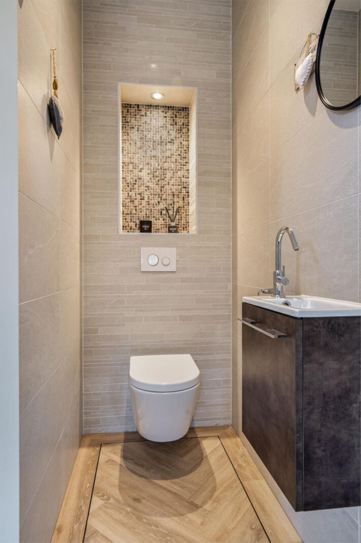 Through the front door you enter the hall where the meter cupboard, the toilet, the door to the living room and the stairs to the upper floor are located. If you walk through to the living room you immediately enter the kitchen. The kitchen is from 2017. The floor in the hallway continues on the entire ground floor. This is a PVC floor from 2022. The entire ground floor also has underfloor heating. The kitchen is equipped with built-in appliances. There is a dishwasher, oven, steam oven and microwave.