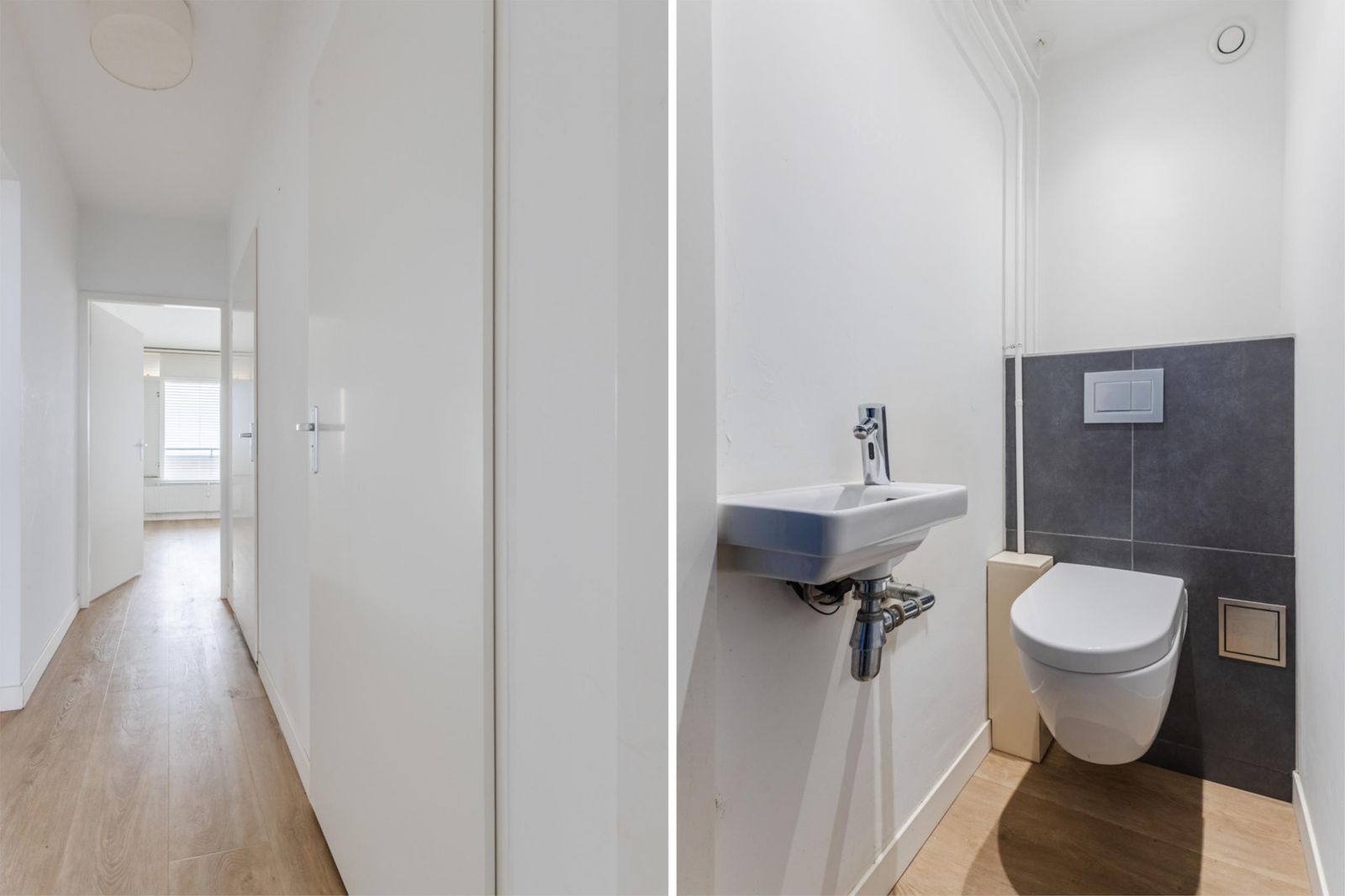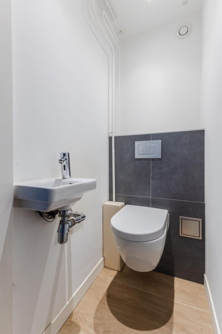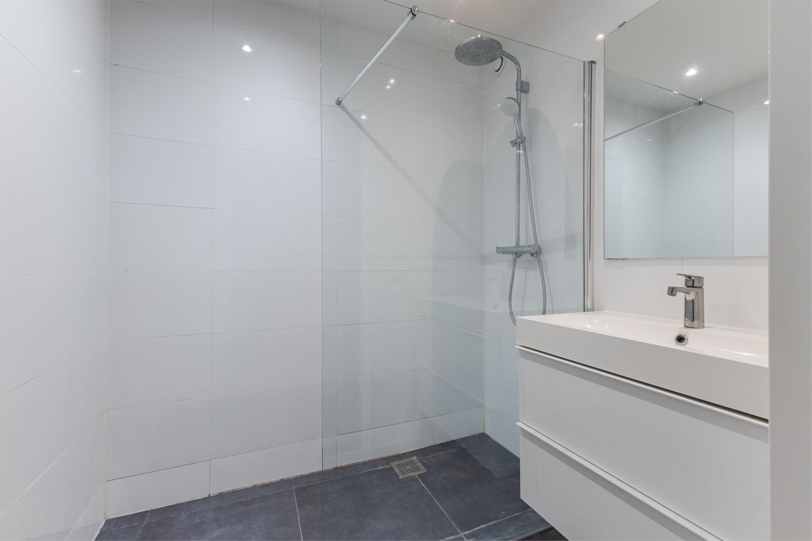 De strakke badkamer is voorzien van een ruime inloopdouche en een modern wastafelmeubel. Daarnaast is er een apart toilet met een sensor gestuurde wastafel én verlichting, wel zo prettig.