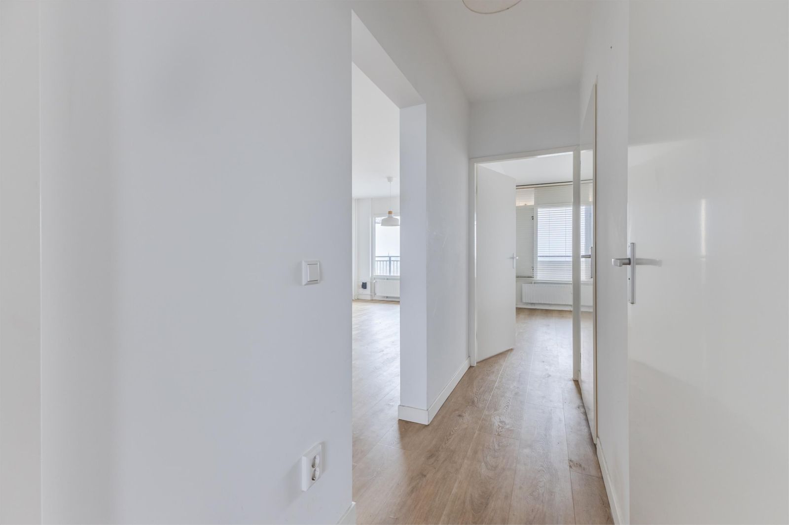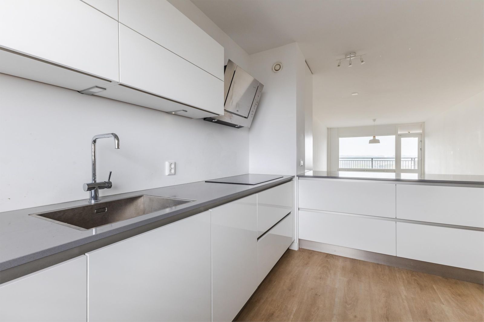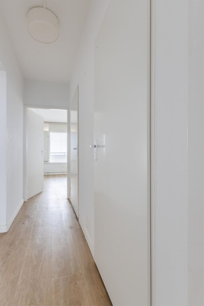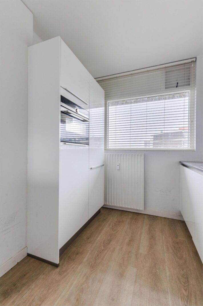 Via de verzorgde, gemeenschappelijke entree bereik je dit stijlvolle appartement. Bij binnenkomst valt meteen de ruime lichte keuken op, compleet met alle wenselijke inbouwapparatuur, een centraal eiland en een grote inbouwkast. Deze ruimte staat in open verbinding met de lichte, royale woonkamer, waar grote ramen zorgen voor een heerlijke hoeveelheid daglicht.
