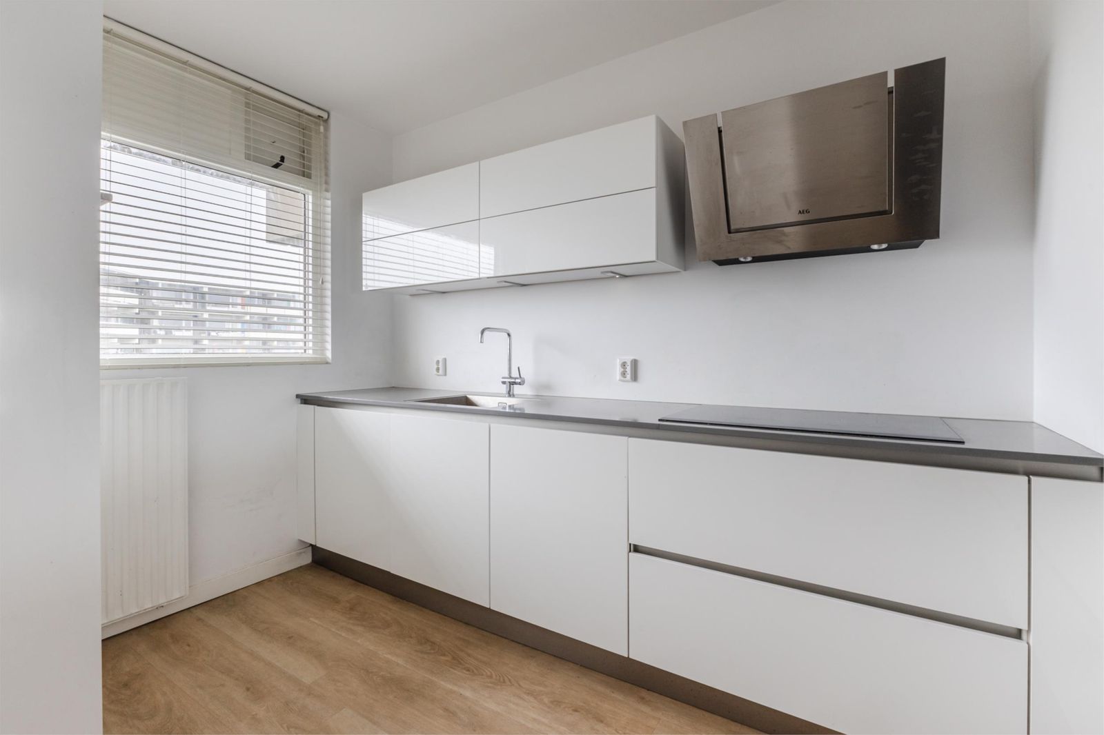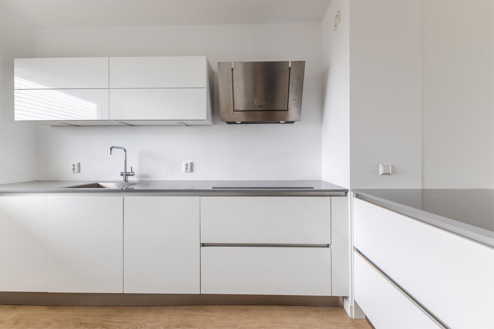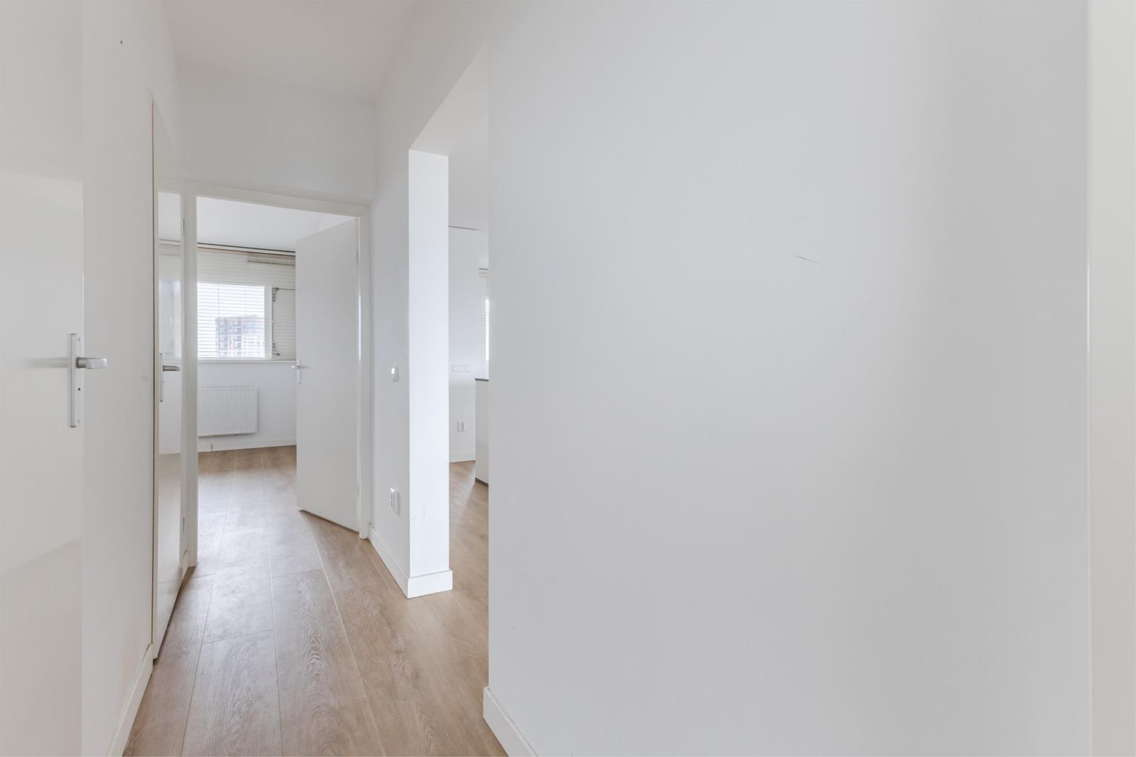 Via de verzorgde, gemeenschappelijke entree bereik je dit stijlvolle appartement. Bij binnenkomst valt meteen de ruime lichte keuken op, compleet met alle wenselijke inbouwapparatuur, een centraal eiland en een grote inbouwkast. Deze ruimte staat in open verbinding met de lichte, royale woonkamer, waar grote ramen zorgen voor een heerlijke hoeveelheid daglicht.
