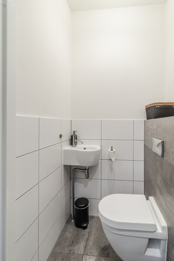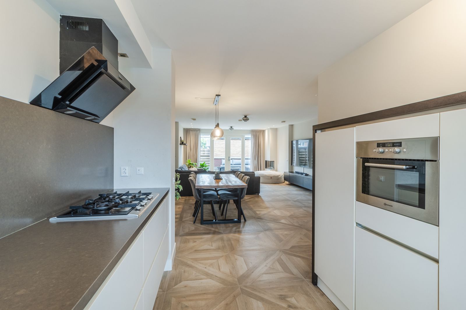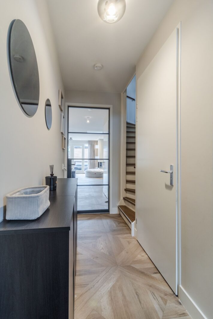 Via de voortuin bereikt u de entree met hal, moderne toiletruimte met hangcloset en fontein en de trapopgang. Aan de voorzijde bevindt zich de ruime open keuken, uitgevoerd in een moderne stijl en voorzien van een vaatwasser, 5-pits gaskookplaat, koelkast, vriezer, combi-oven en afzuigkap.