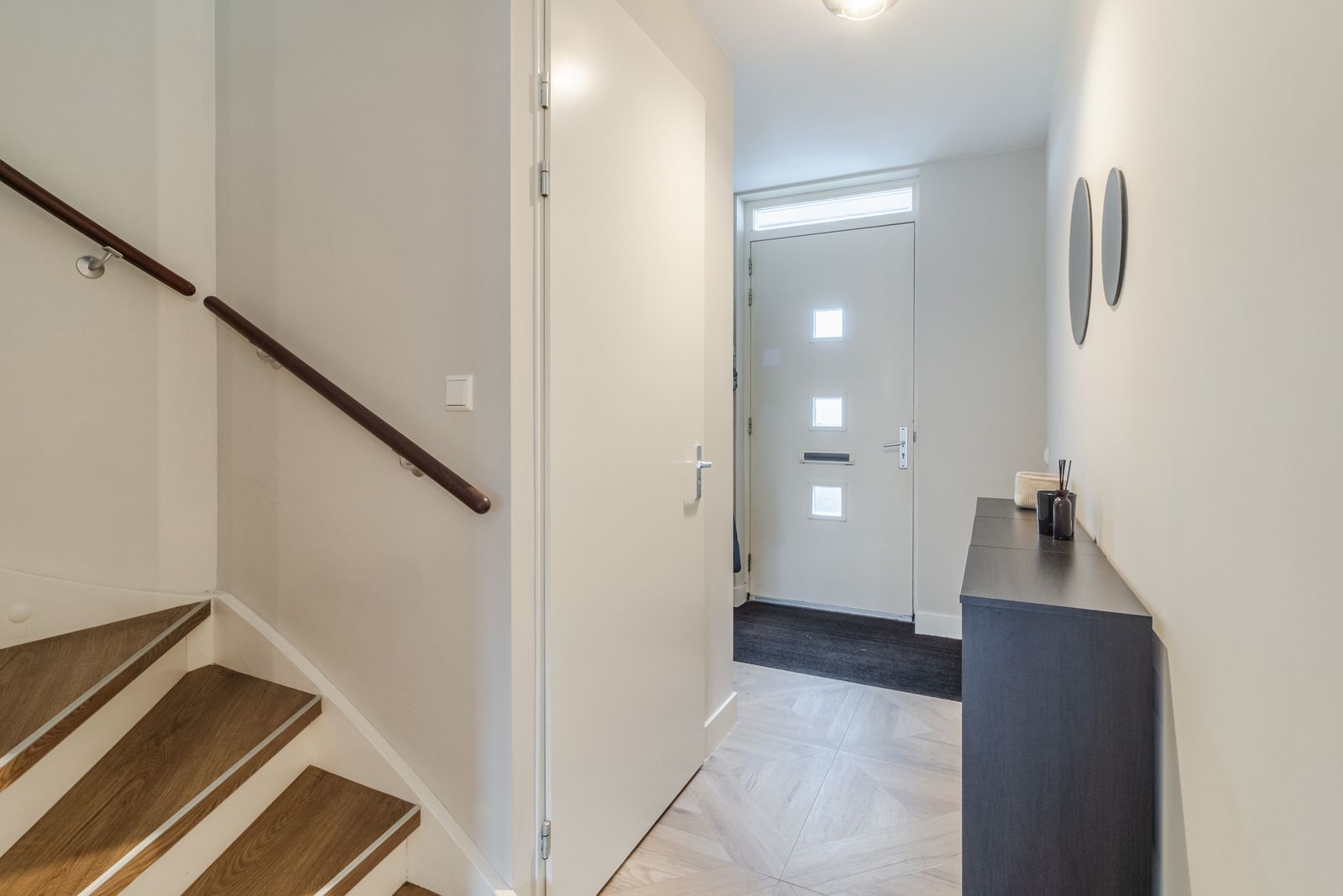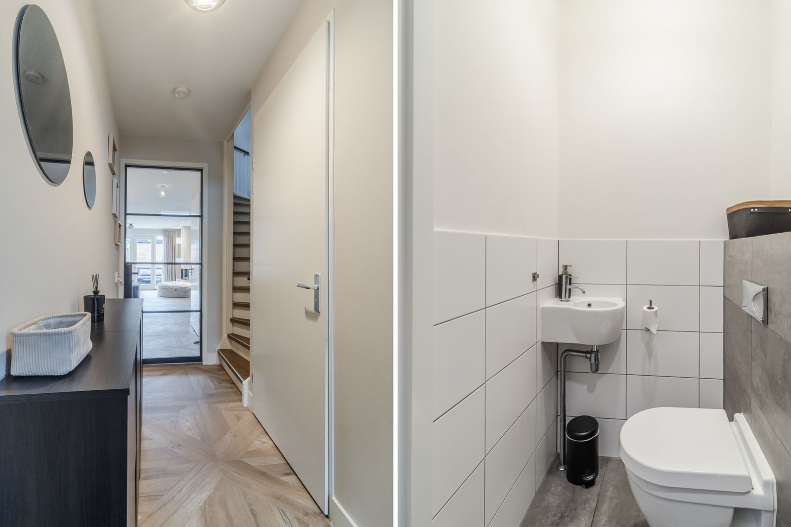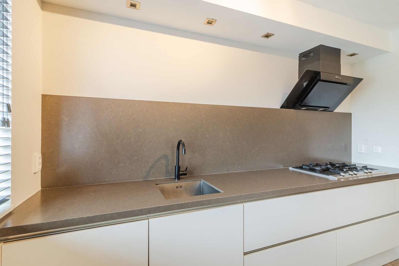 Via de voortuin bereikt u de entree met hal, moderne toiletruimte met hangcloset en fontein en de trapopgang. Aan de voorzijde bevindt zich de ruime open keuken, uitgevoerd in een moderne stijl en voorzien van een vaatwasser, 5-pits gaskookplaat, koelkast, vriezer, combi-oven en afzuigkap.