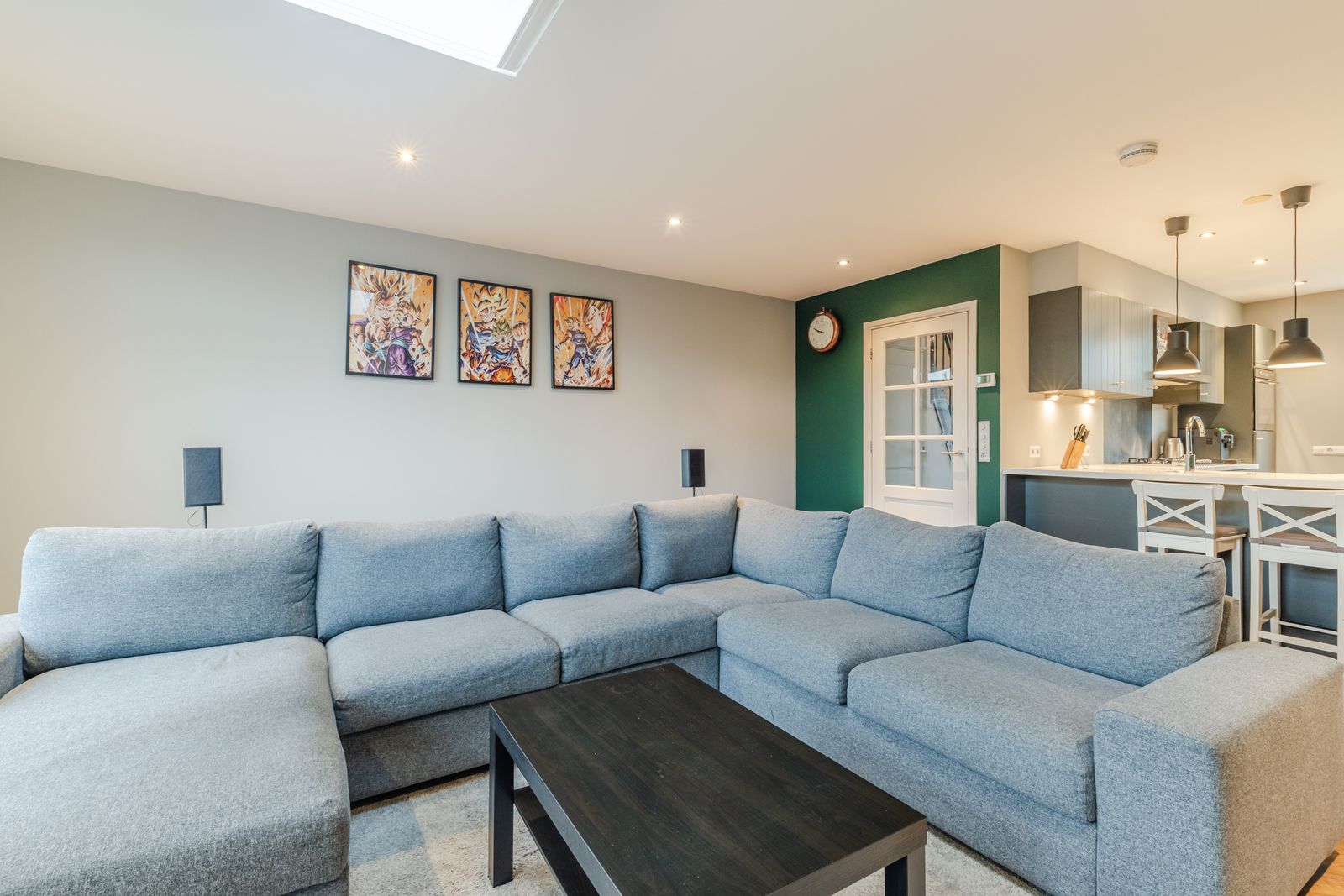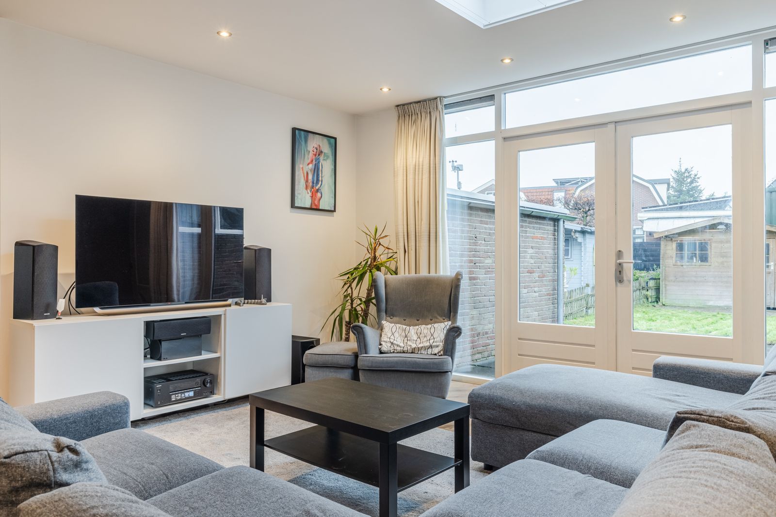• Royale woonkamer in de uitbouw, voorzien van een lichtkoepel en openslaande deuren naar de achtertuin.