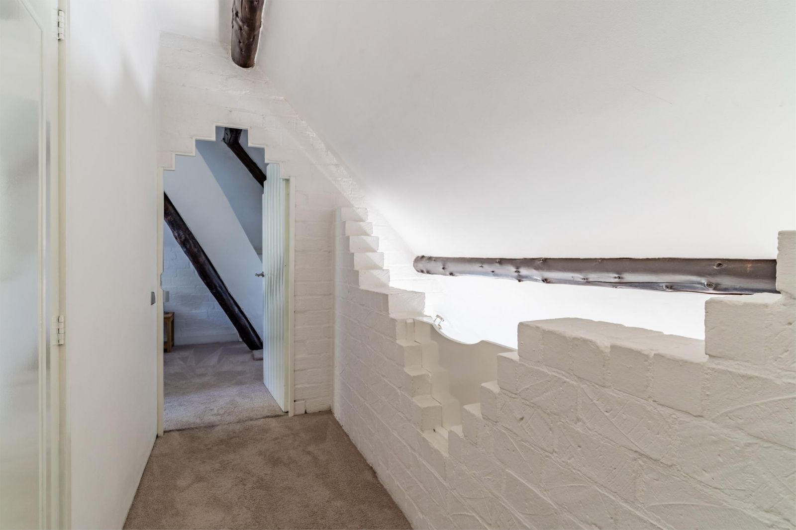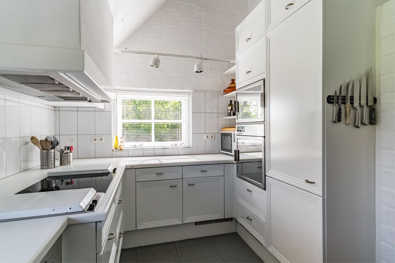 Beletage/1e verdieping: hal/trappenhuis met toilet, werkkamer/slaapkamer voorzien van op maat gemaakte kastenwand, keuken, ruime woonkamer met moderne houtkachel en openslaande deuren naar het terras van 3 x 6 meter op dezelfde hoogte. Het terras ligt op het Zuiden en heeft de hele dag zon. Een trap biedt toegang tot de tuin. De woonkamer en keuken hebben vloerverwarming.