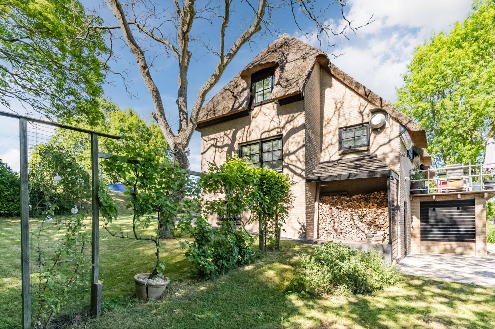 Het huis is gebouwd in 1977 en heeft ruim 200m2 woonoppervlak exclusief de inpandige garage/hobbyruimte van 32m2 welke relatief makkelijk zou kunnen worden verbouwd tot bijvoorbeeld een woonkeuken of twee ruime slaapkamers. Het huis is onder architectuur gebouwd en dit ziet u terug in de speelse indeling met veel hoogteverschillen en trapvormen overal in huis. De woning is in de afgelopen 8 jaar jaar flink verduurzaamd: rondom nieuwe deuren en kozijnen met grotendeels HR++ glas en modern hang en sluitwerk. Het rieten dak is in 2017 volledig vernieuwd en voorzien van een brandwerende onderlaag en hoogwaardige isolatiematerialen. In 2024 is het onderhoud gedaan en heeft het dak een anti-mos behandeling gehad. Daarnaast is rondom het huis in 2022 een waterafvoer/drainage systeem aangelegd. De woning is aangesloten op het glasvezelnetwerk, dus onbeperkt streamen, bellen en werken zonder problemen.