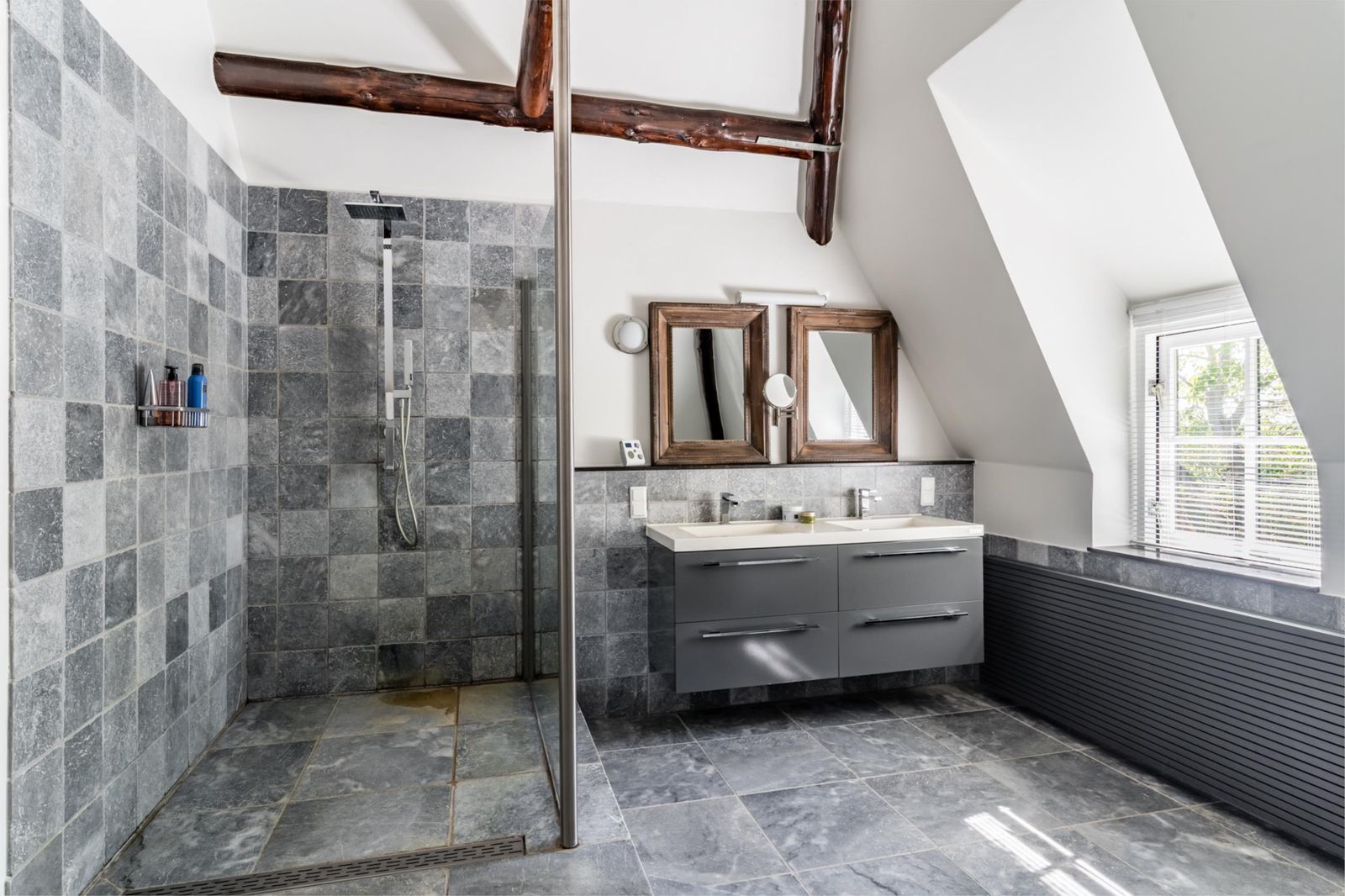 Bovenverdieping: overloop met vide, zeer ruime badkamer met tweepersoons ligbad, 3e toilet, royale inloopdouche en dubbel wastafelmeubel, slaapkamer/kleedkamer met op maat gemaakte kastenwanden en nog een 4de slaapkamer.