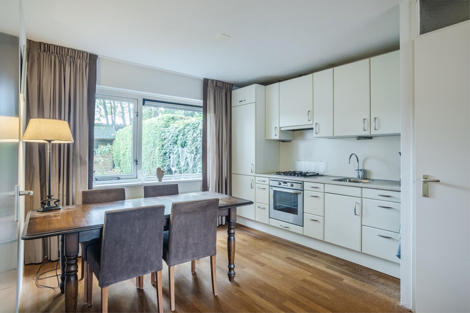 Naast de keuken bevindt zich een handige bijkeuken, met aansluiting voor de wasmachine en toegang tot de achtertuin.