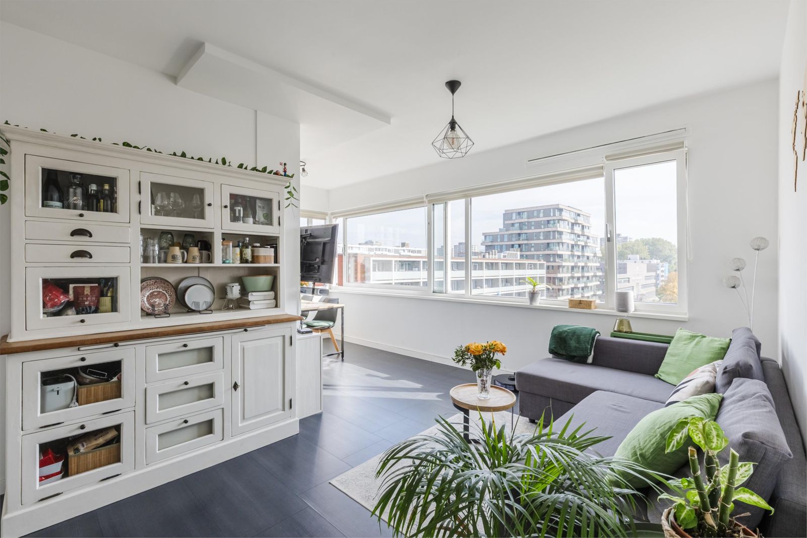 Via de lift of trap bereikt u de vijfde verdieping waar het appartement is gelegen. De woonkamer springt direct in het oog door de hoekligging en de grote ramen, die de hele dag door zorgen voor een lichte en uitnodigende sfeer.