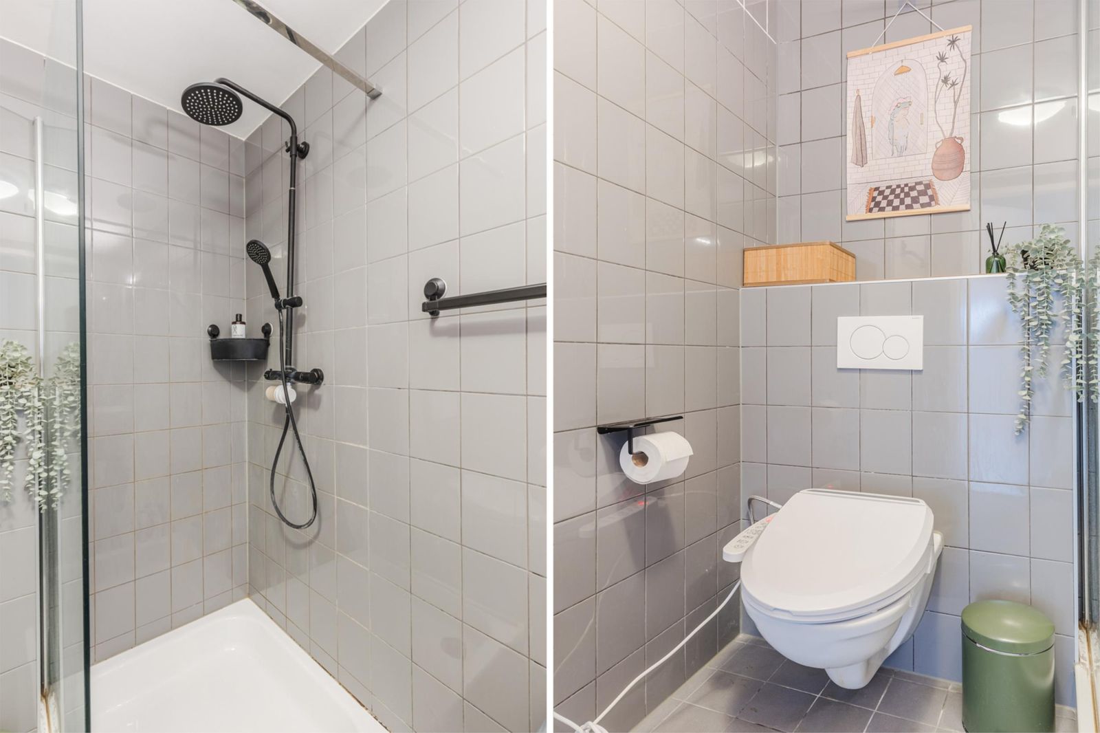 De badkamer is modern en ruim opgezet, voorzien van douche, wastafel, toilet en een aparte bergruimte met wasmachine-aansluiting.
