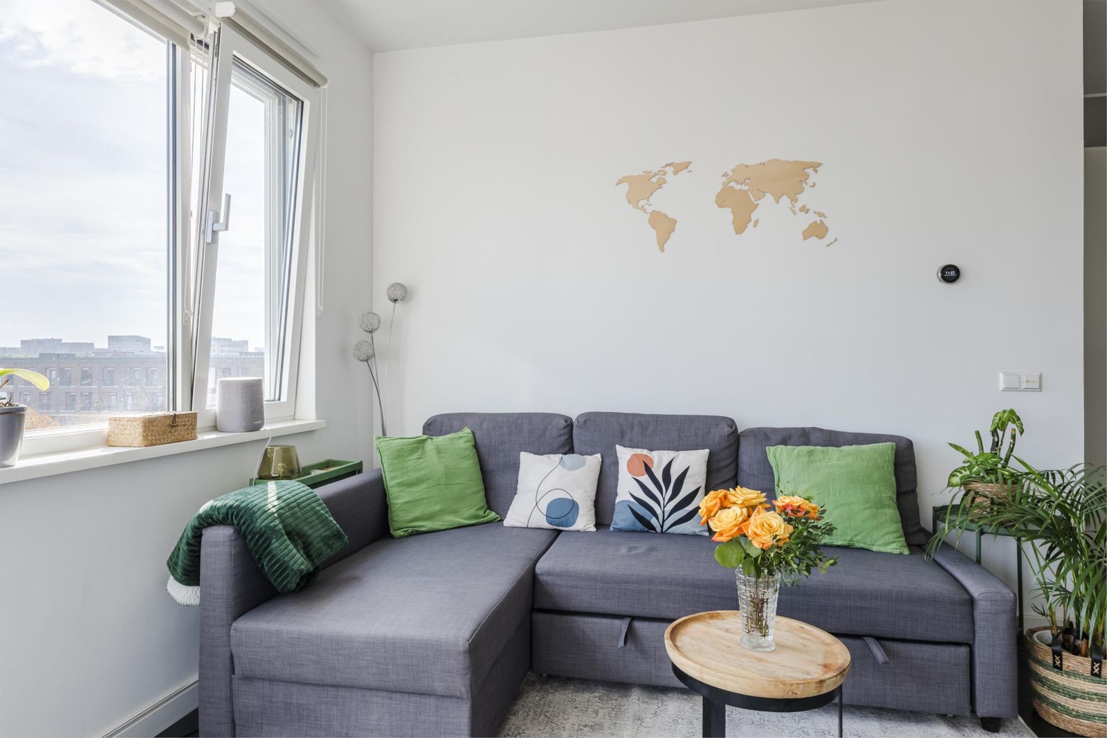 Via de lift of trap bereikt u de vijfde verdieping waar het appartement is gelegen. De woonkamer springt direct in het oog door de hoekligging en de grote ramen, die de hele dag door zorgen voor een lichte en uitnodigende sfeer.