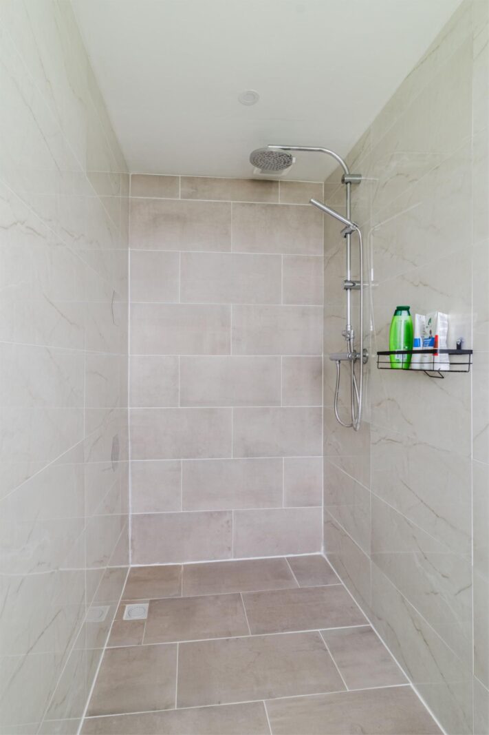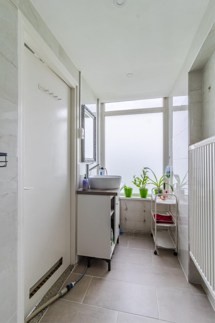 De moderne badkamer (3,31m. x 1,16m.) is gerenoveerd in 2020 en heeft een beige kleurstelling beschikt over een vaste wastafel, badkamermeubel met spiegel en doucheruimte.